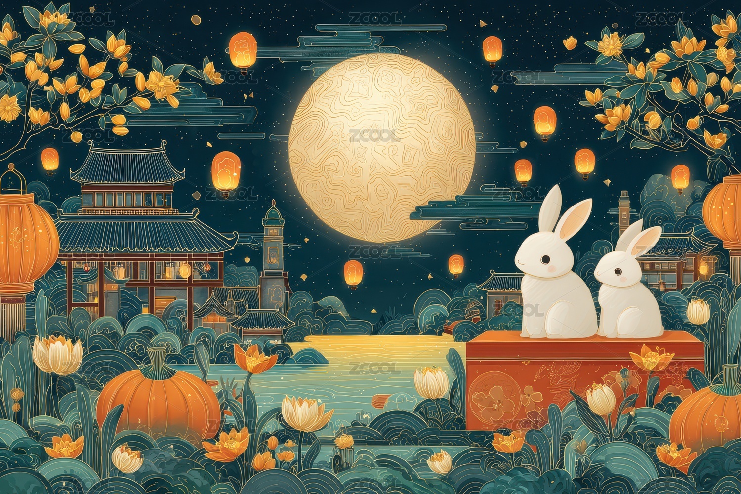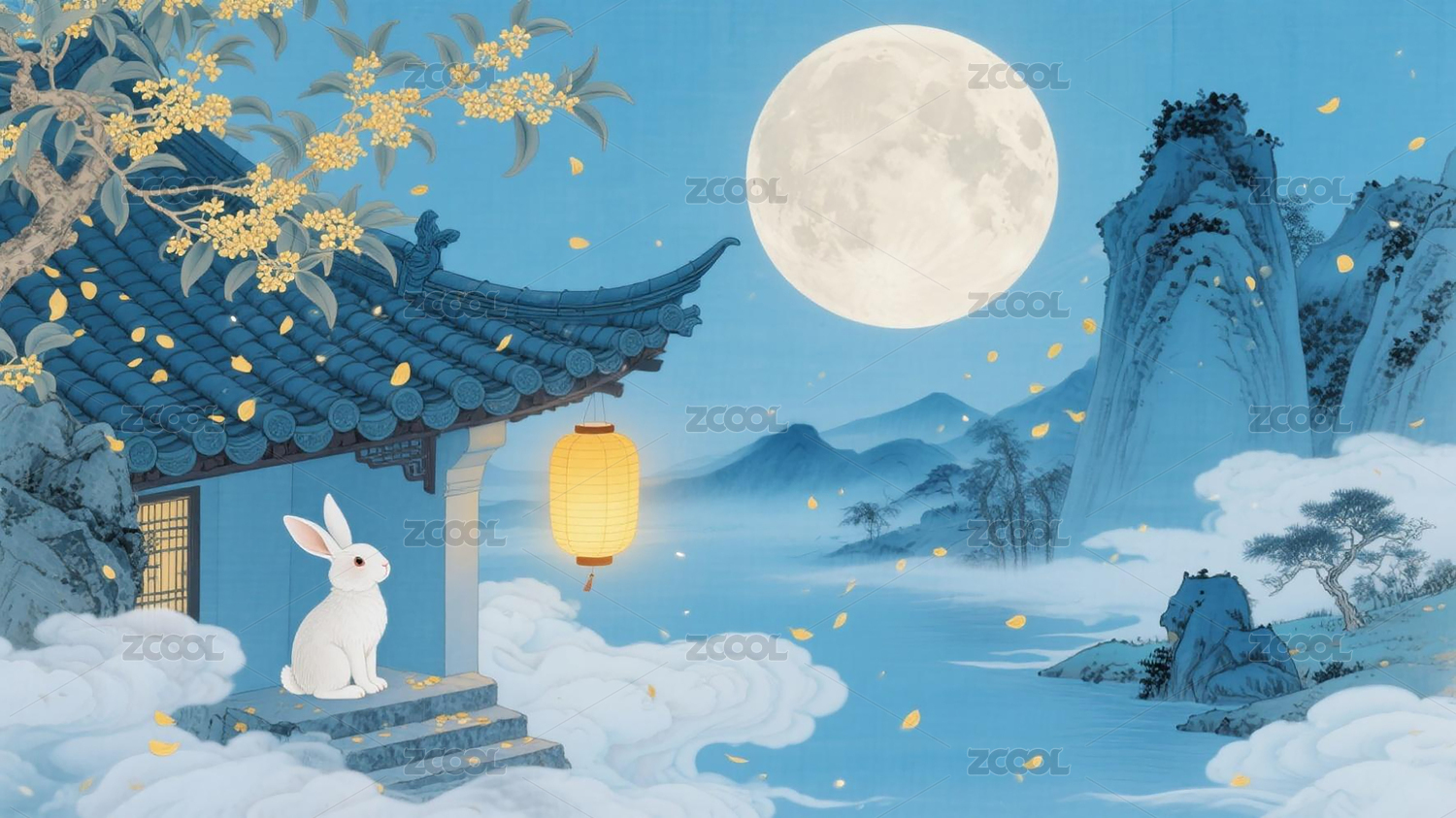 宁静夜晚,满月,山脉,薄雾,传统建筑,黄色灯笼,白色兔子,黄色花瓣,梦幻氛围,平和祥和