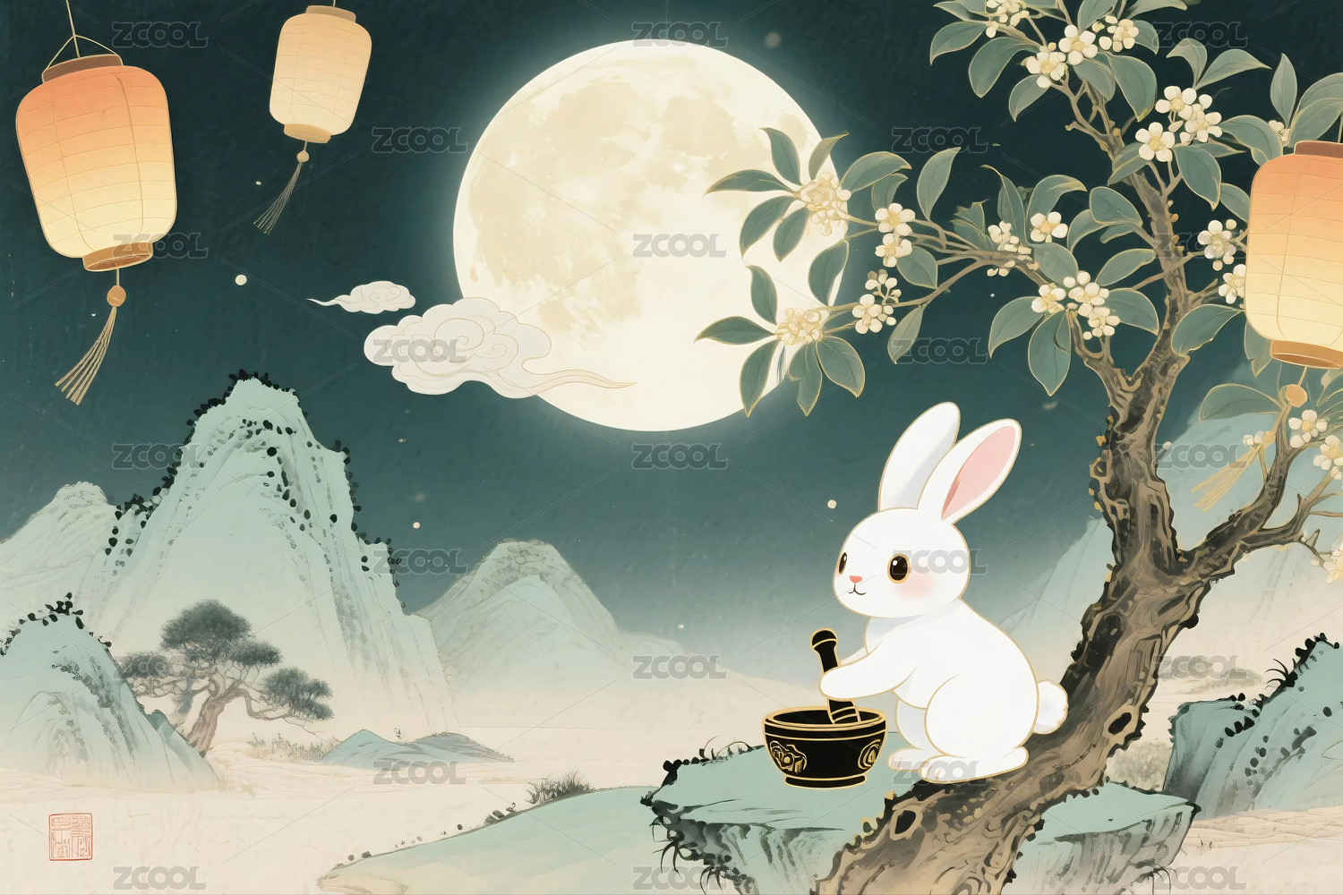 中秋节海报插画兔子玉兔在桂花树下捣药
