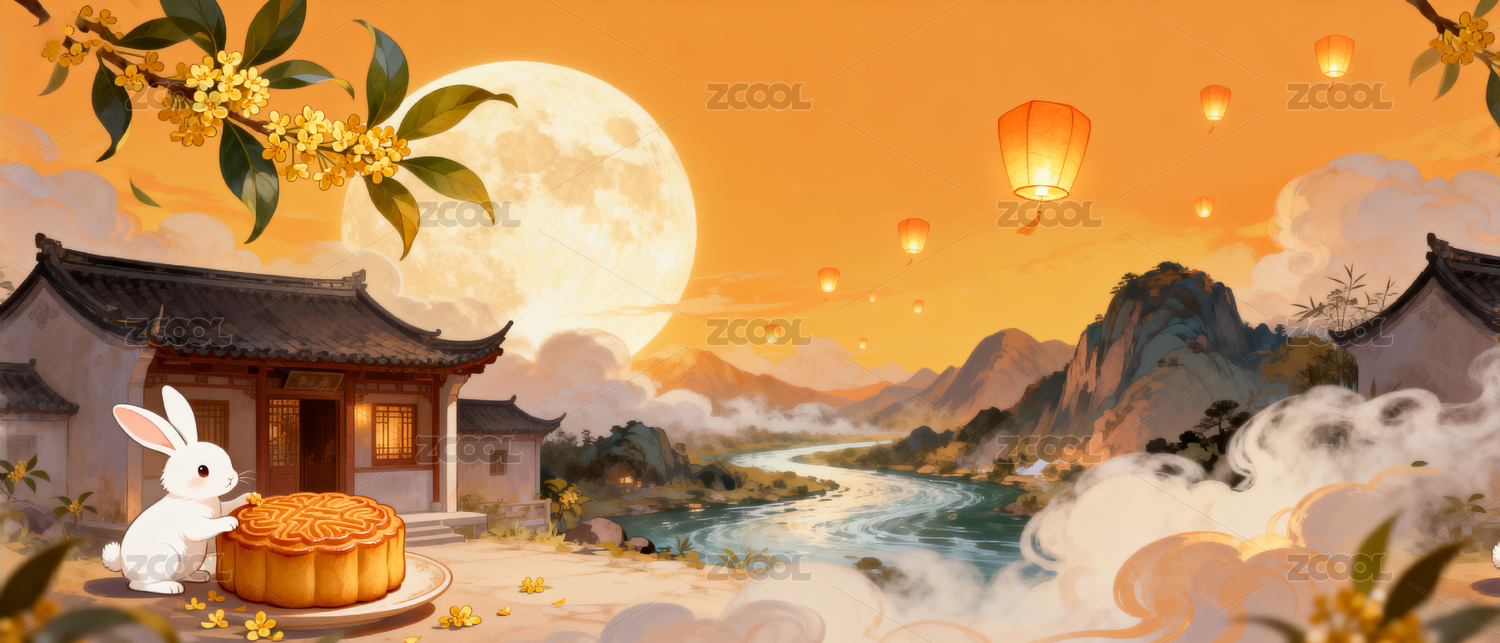 宁静夜晚,满月,山脉,薄雾,传统建筑,黄色灯笼,白色兔子,黄色花瓣,梦幻氛围,平和祥和