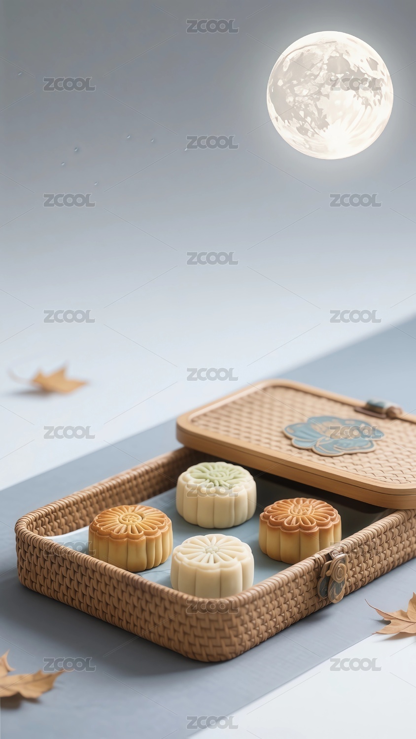 月饼特写,礼盒包装,金色装饰,丝绸衬布,柔焦光影,留白构图,商业质感,高级色调