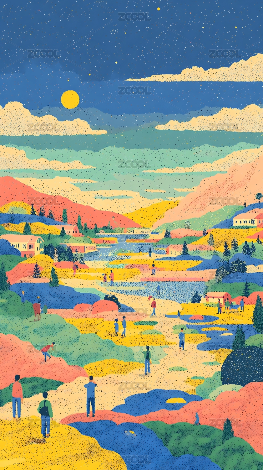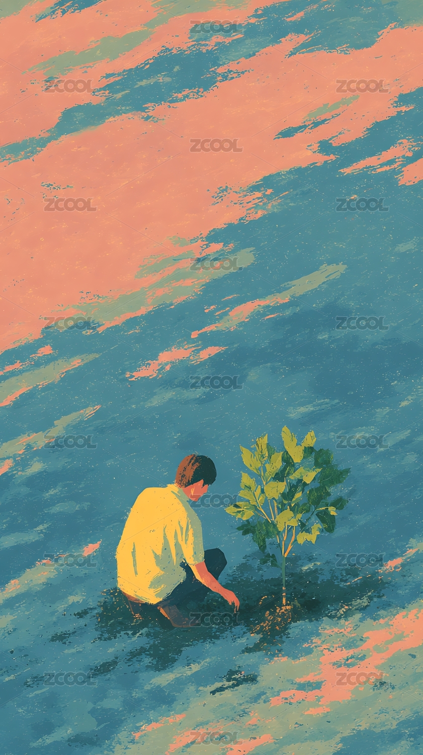 人物,天空,蓝色,户外,植树,风景,自然,艺术,橙色,黄色