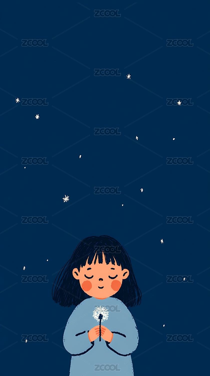 女孩仰望星空吹蒲公英