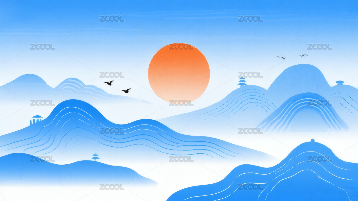 蓝白渐变,蓝色,白色,中式美学,新中式,山峦,山水画,扁平风,日出,线条