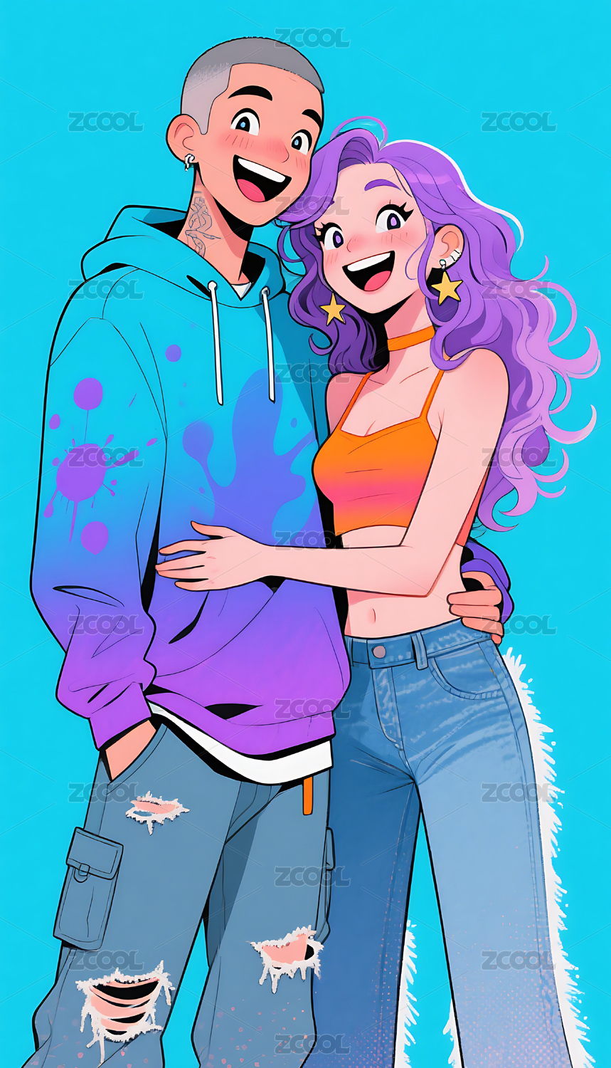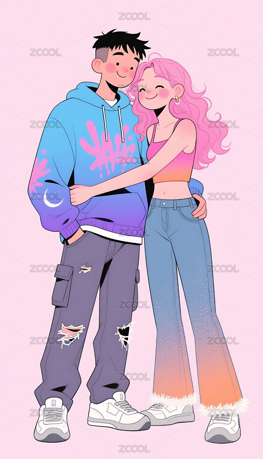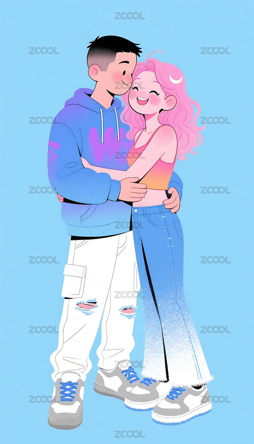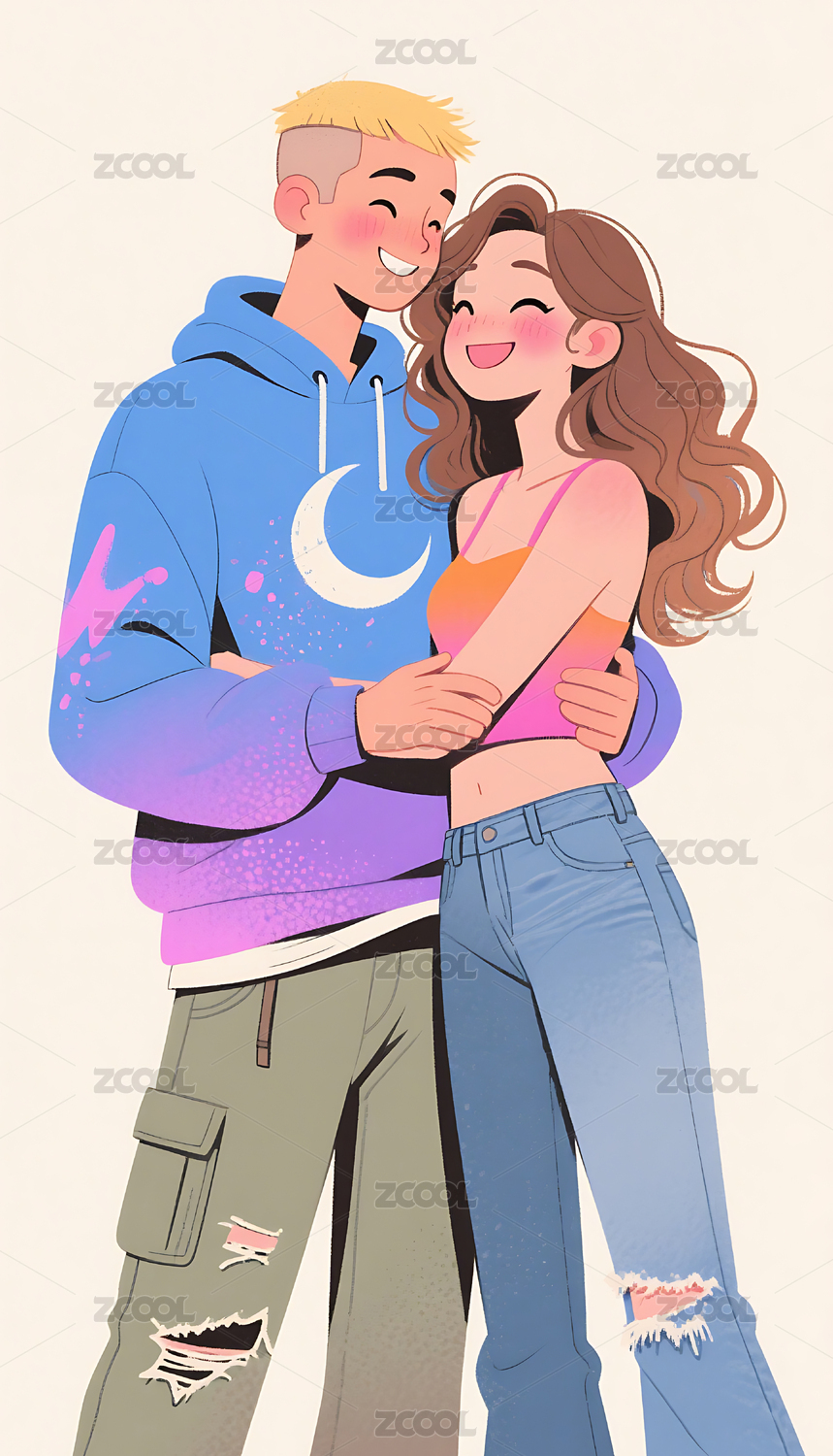扁平风格美式时尚情人节情侣拥抱亲吻插画