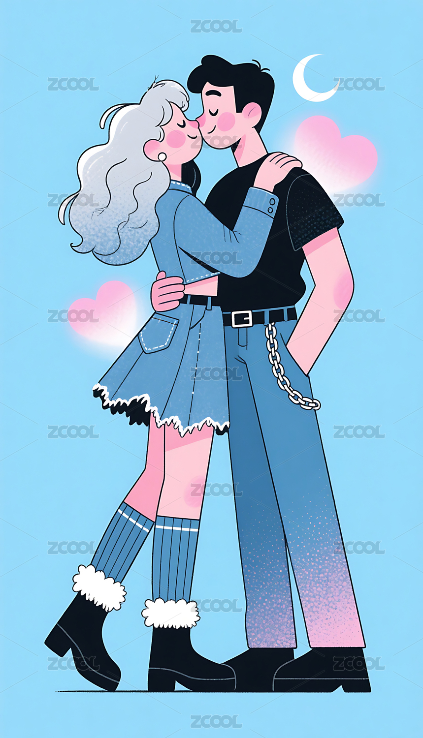 扁平风格美式时尚情人节情侣拥抱亲吻插画