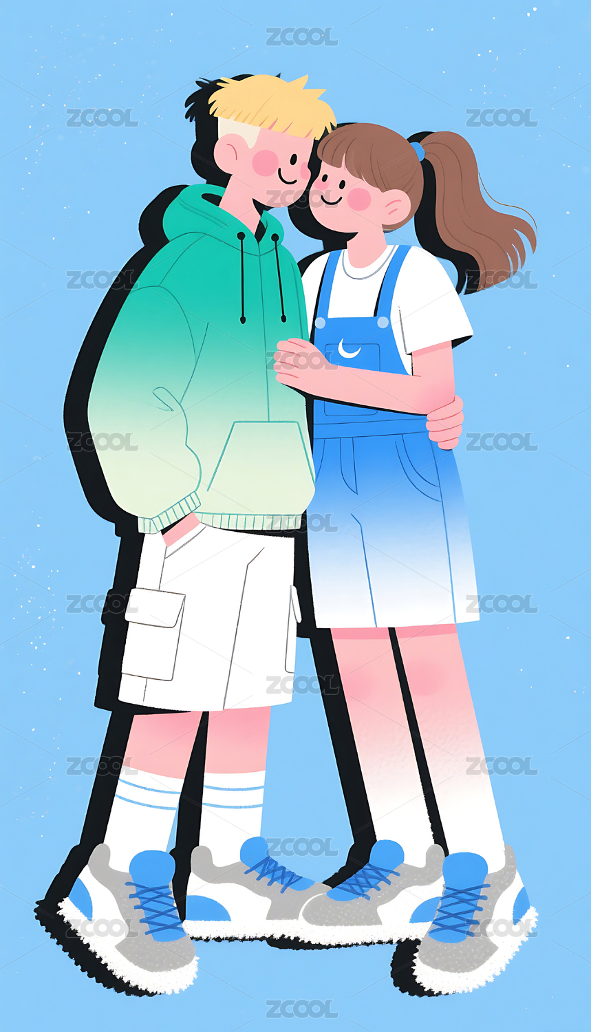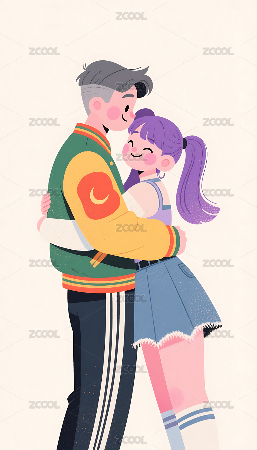扁平风格美式时尚情人节情侣拥抱亲吻插画