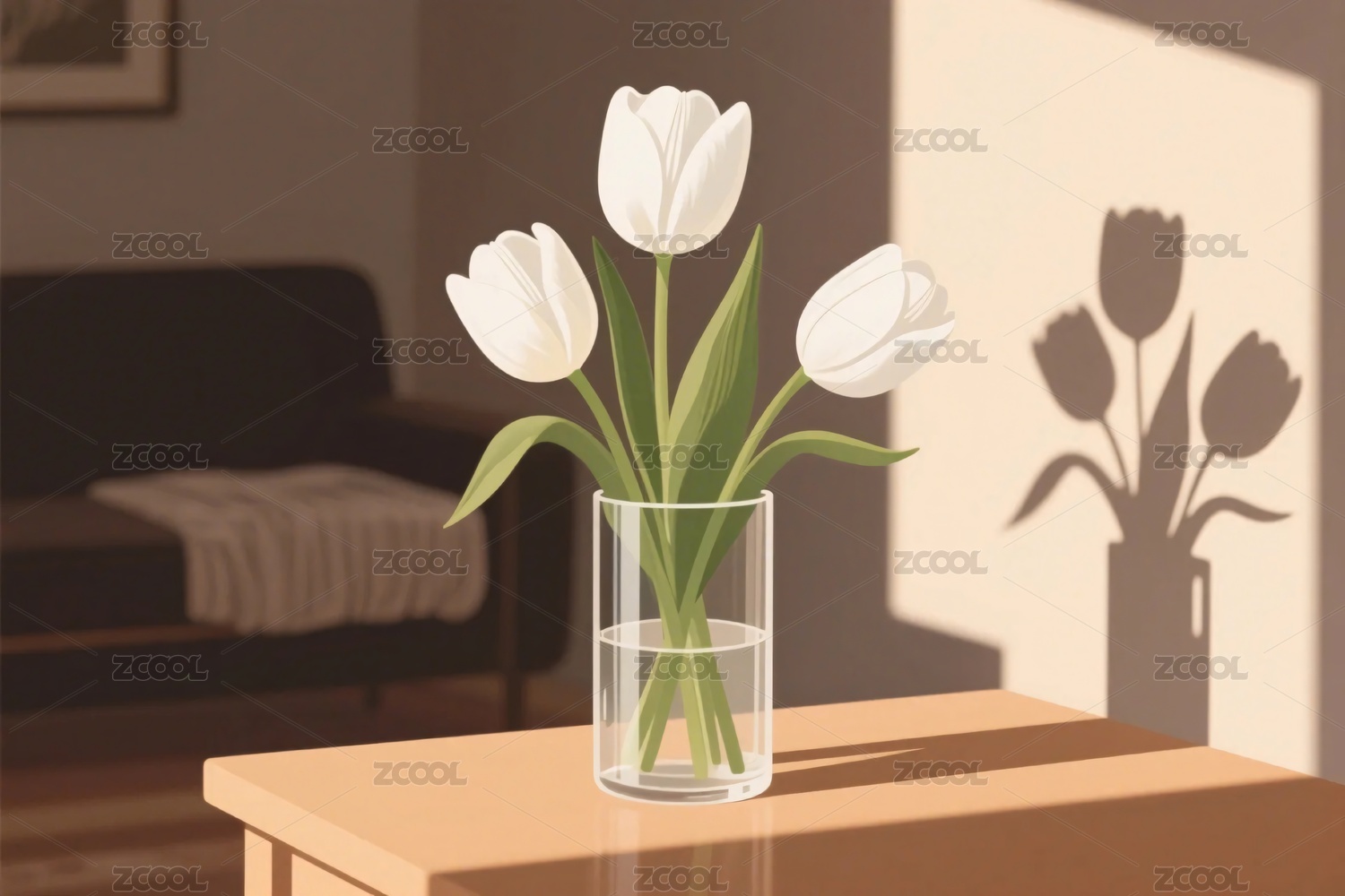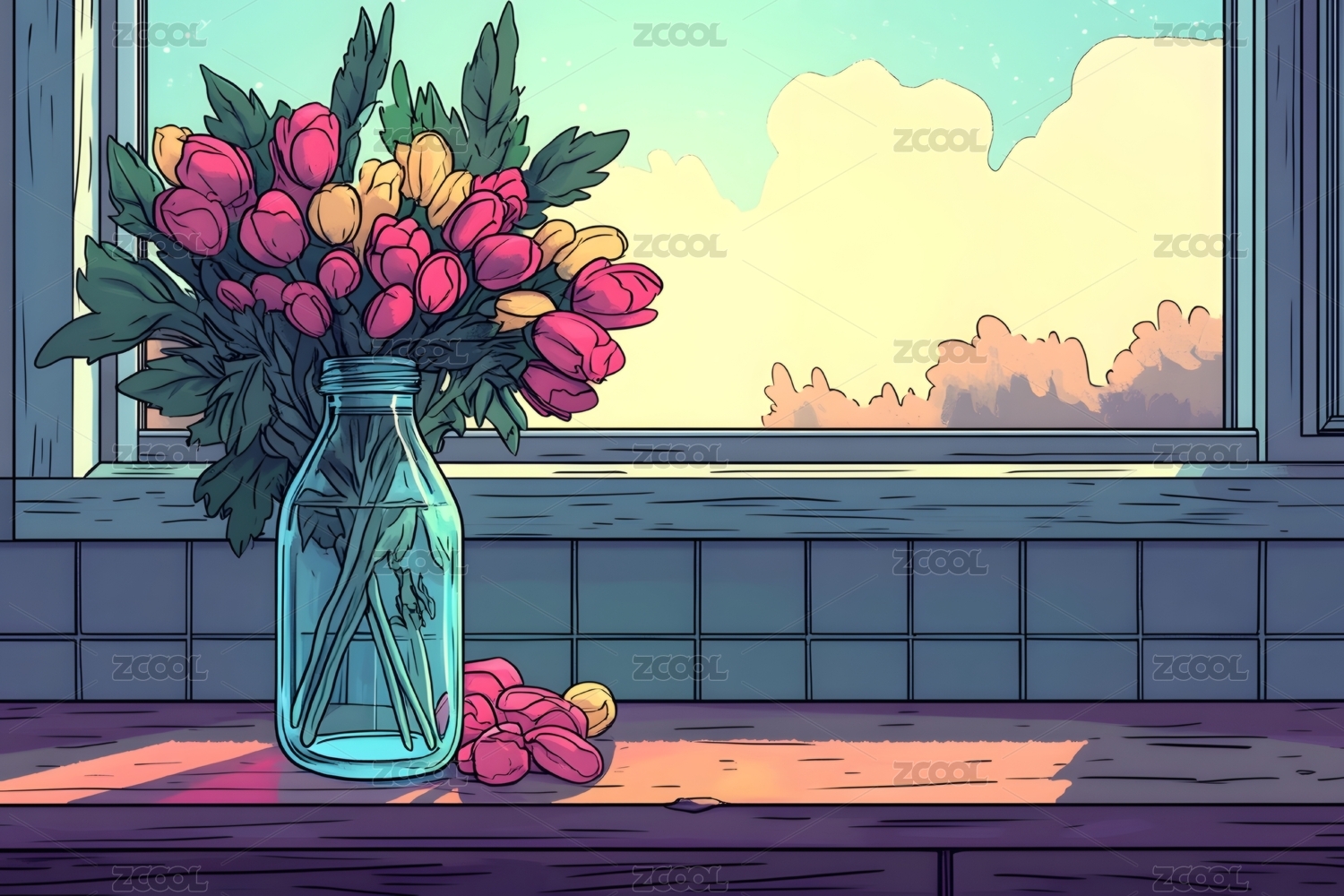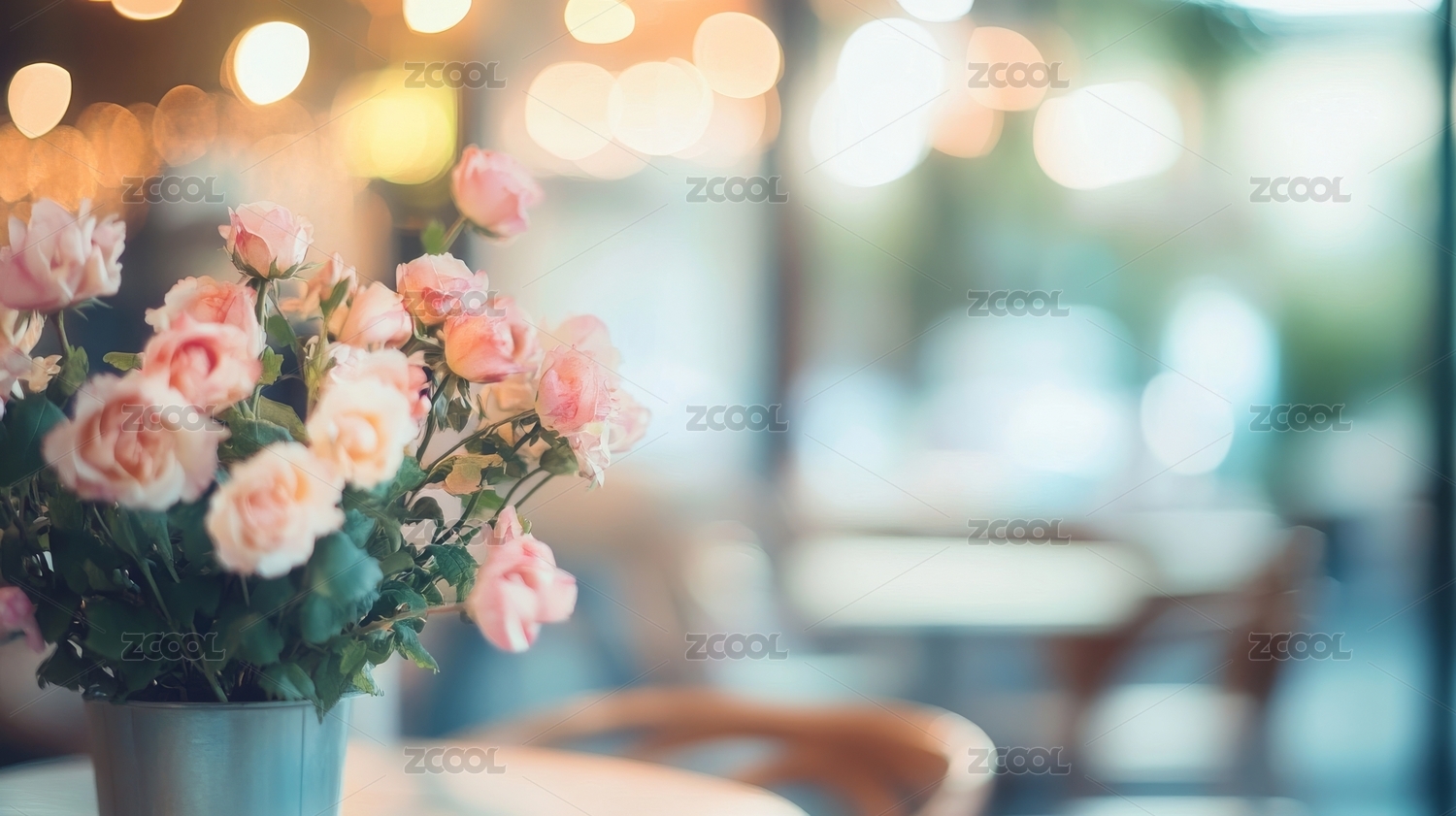 咖啡厅的桌子上摆放着一束玫瑰花插画图