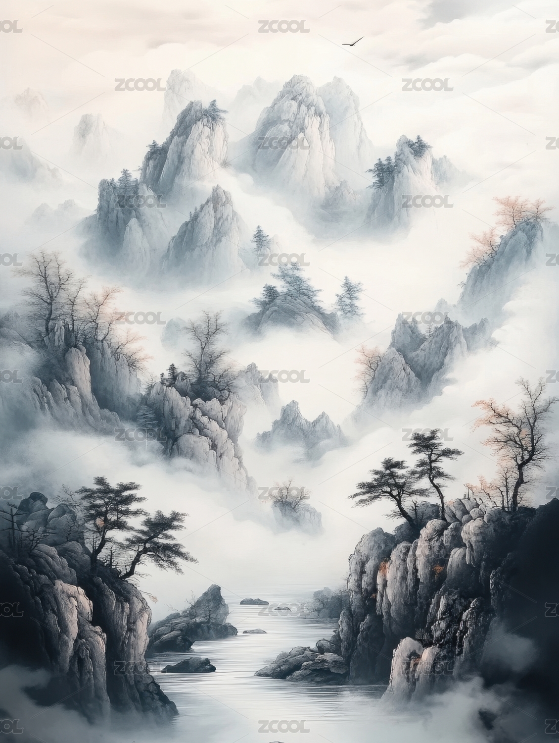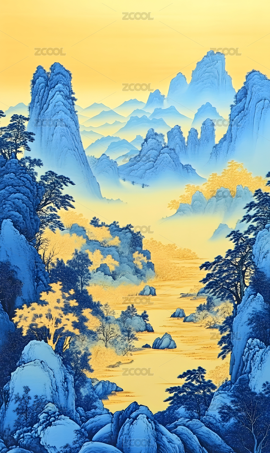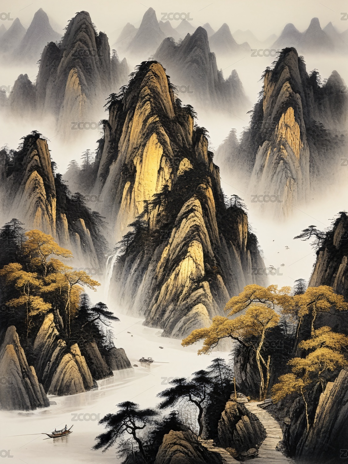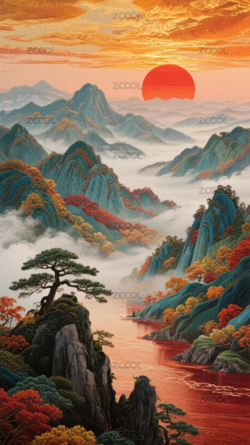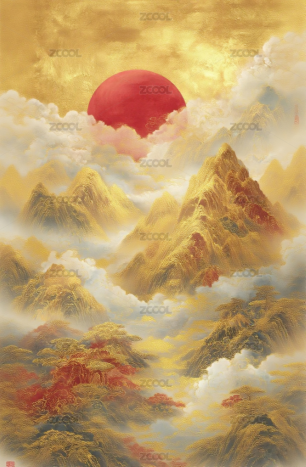 金山,山脉,山峰,插画,装饰画,国风,艺术,红日,红太阳,群山
