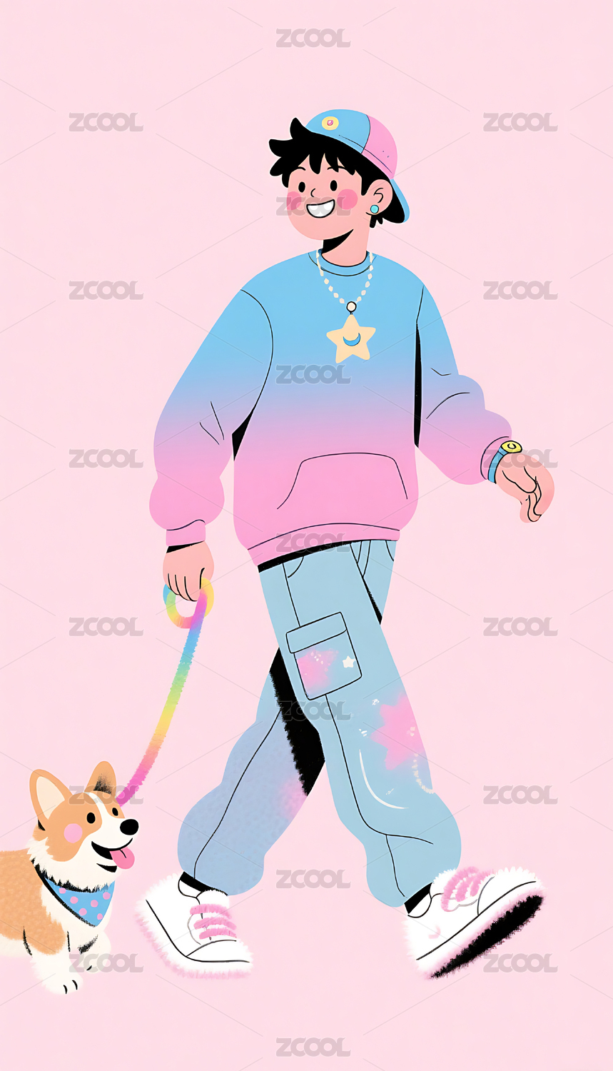 遛狗,漂亮,扁平风格,质感,渐变,时尚,插画,素材,平面,插图