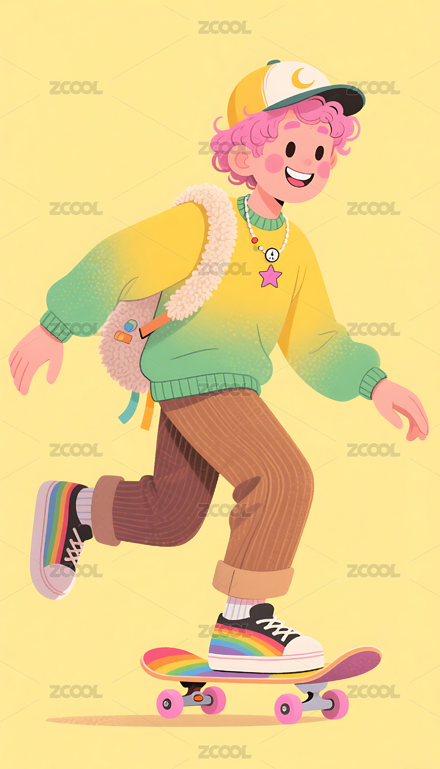 扁平风格美式时尚穿搭滑板少年插画