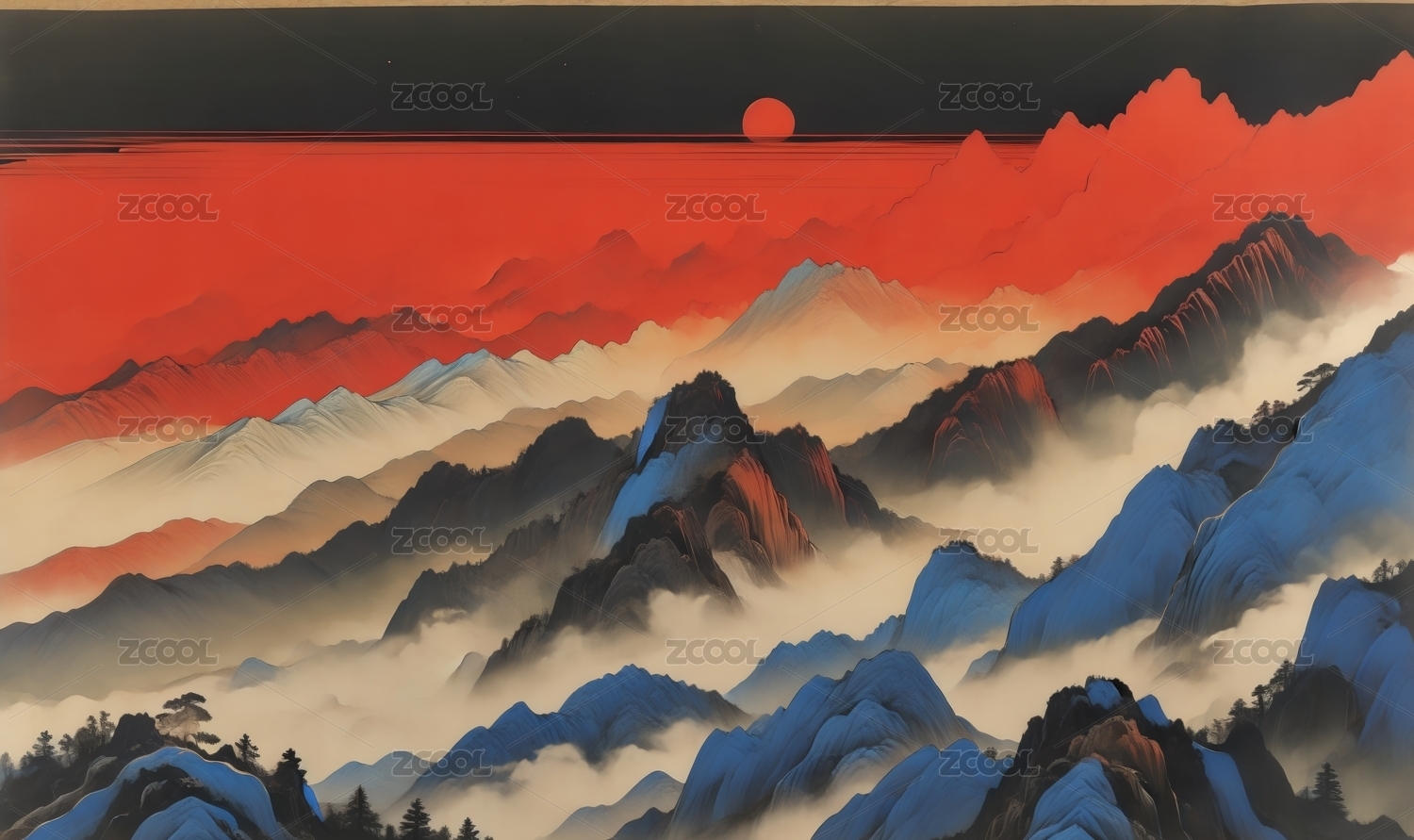 水墨风层叠山峦云雾中式景观图