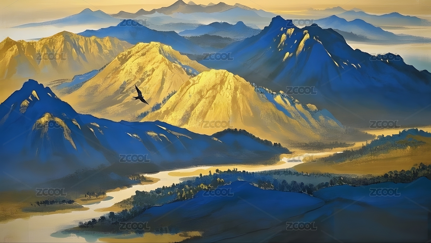 传统山水新国风国潮青绿背景壁纸画