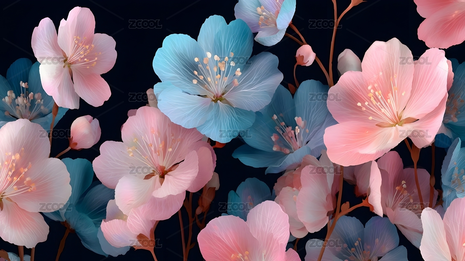 粉色蓝色花卉黑色背景图案