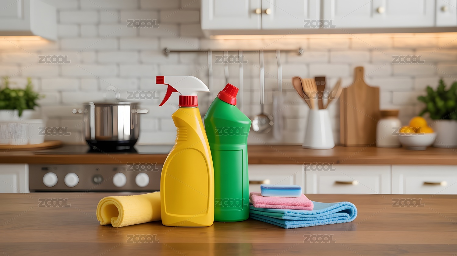 厨房中的多彩清洁用品,注重家庭卫生与消毒