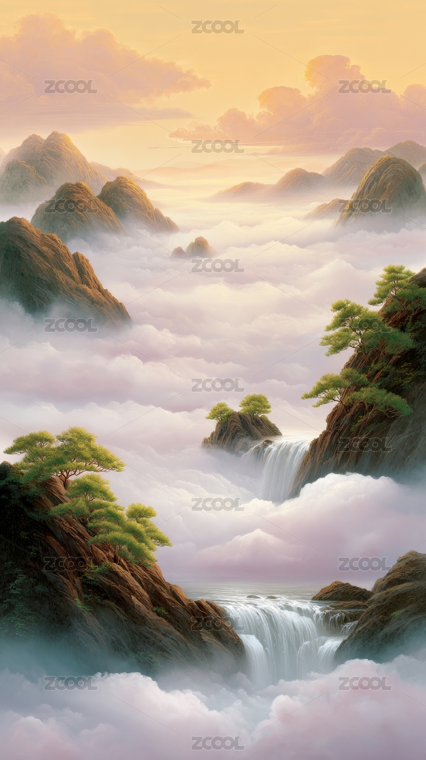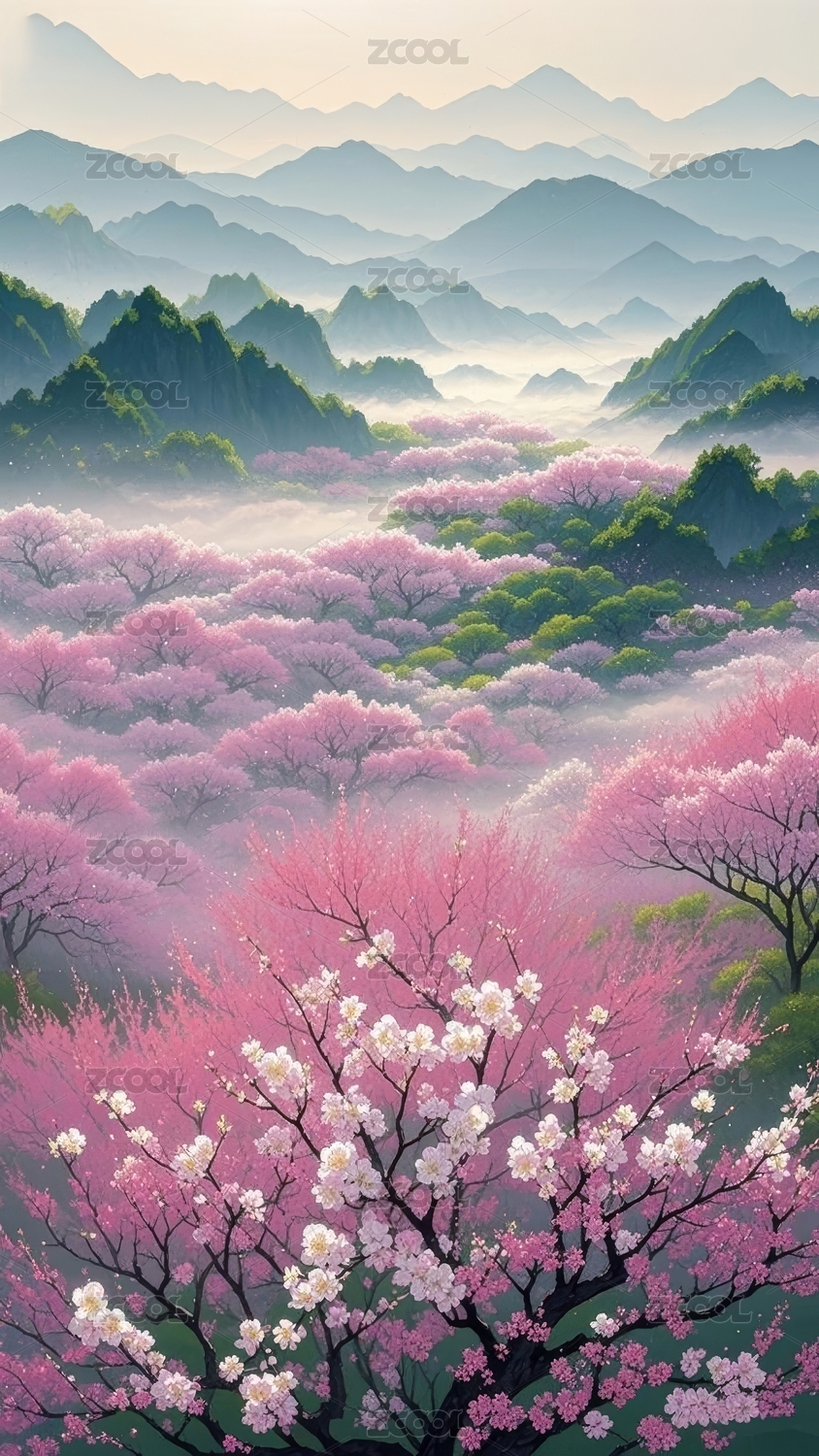 水墨画,千里江山,风景,树木,紫色,天空,插画,高山,云雾,写意