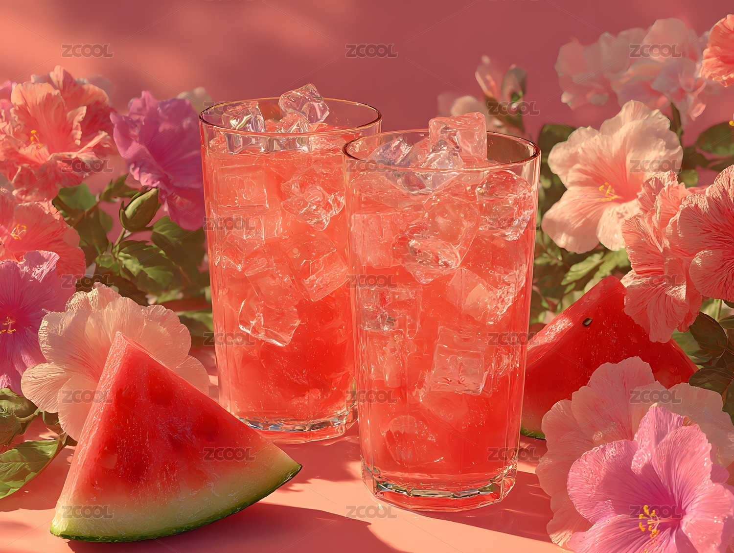 西瓜饮品搭配鲜花粉色氛围