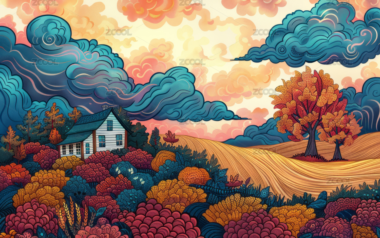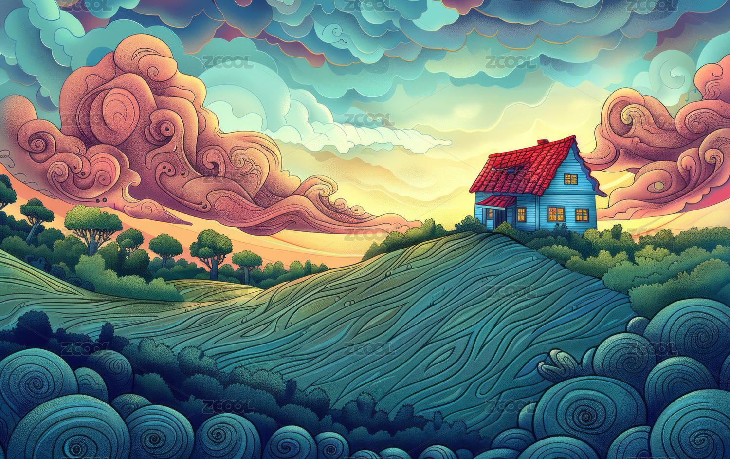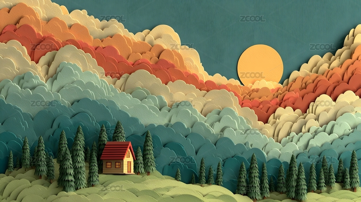 山脉,自然,风景,蓝色,设计,橙色,房屋,山,树,太阳