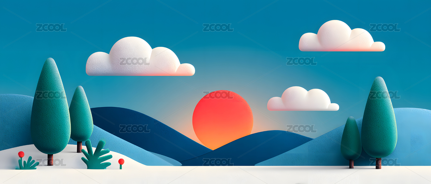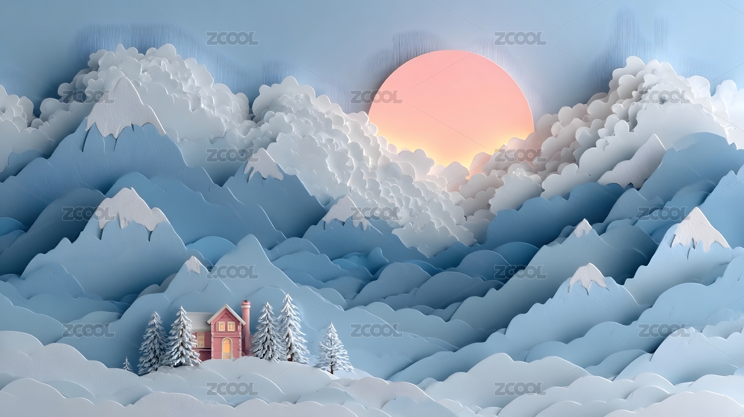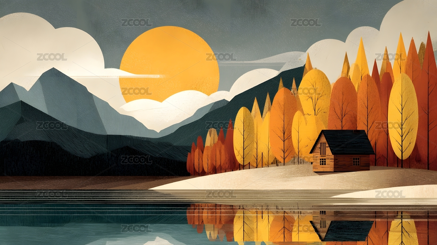 远山,自然,风景,云朵,宁静,设计,暖色,风格,房屋,太阳