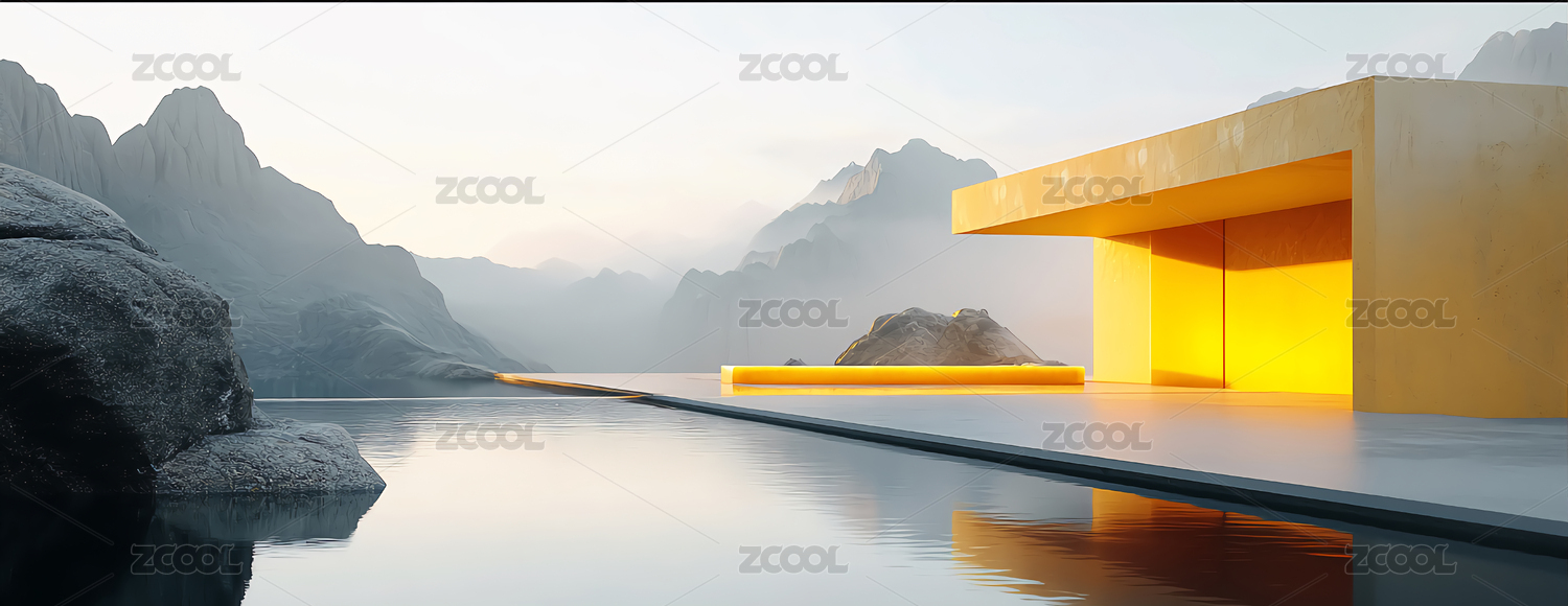 建筑,三维,场景,天空,地形,水,游泳池,背景,黄色,光影