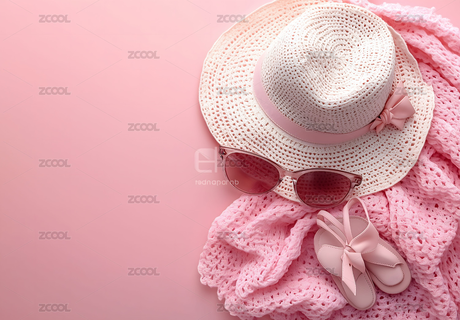 风格,静物,组合,浅棕色,宽边草帽,粉红色,太阳镜,针织毯子,绿色,棕榈叶