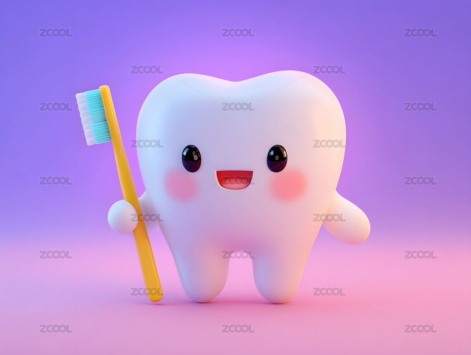 3D立体卡通风格C4D拿着牙刷的牙齿
