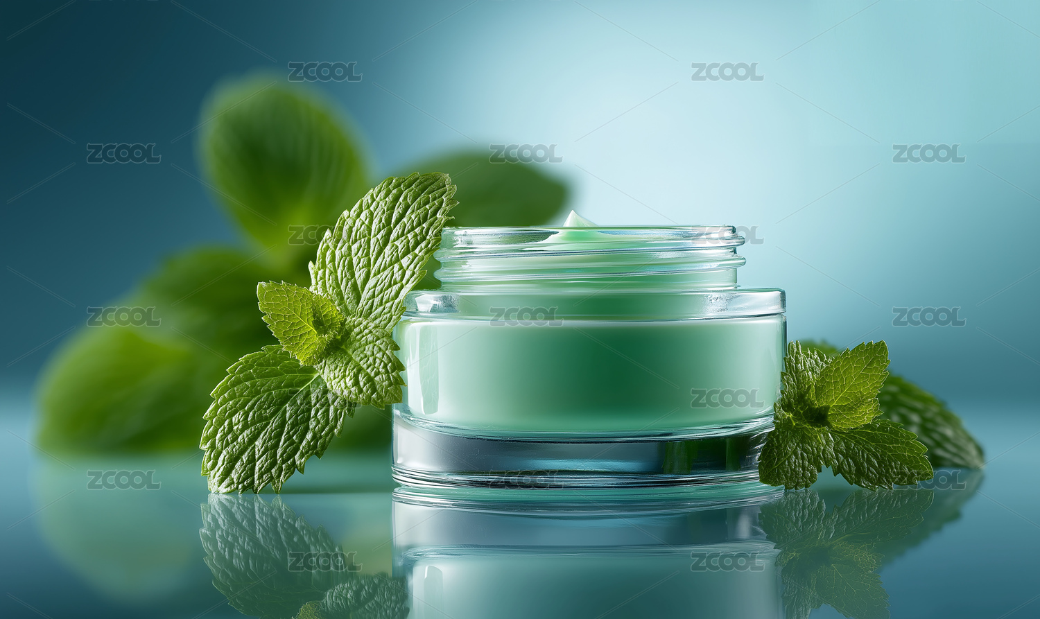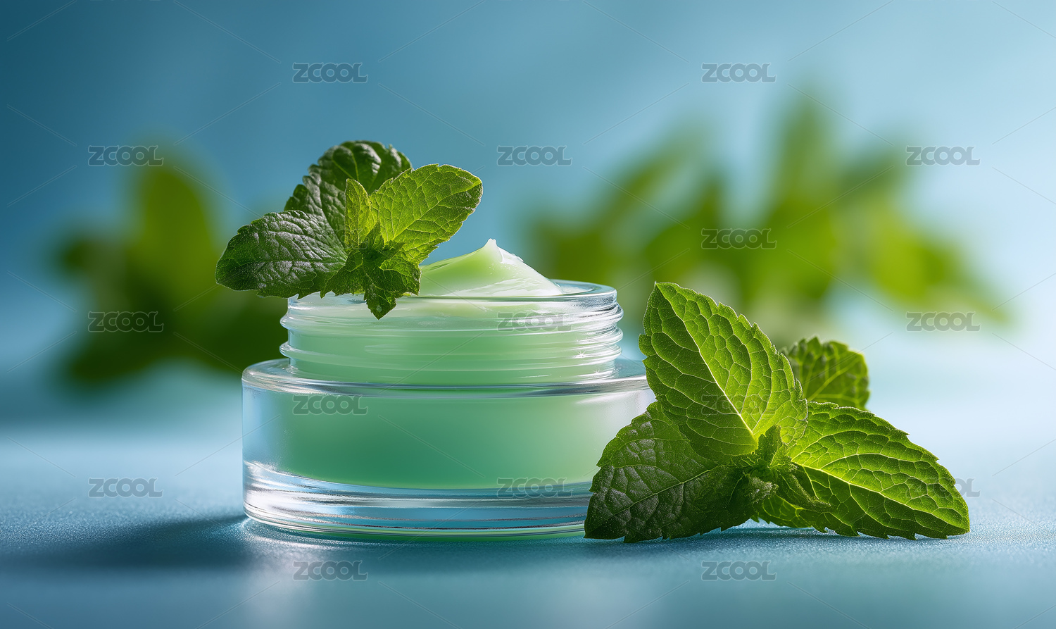 面霜,玻璃,罐子,薄荷,绿叶,绿色,清新,护肤,美妆,产品