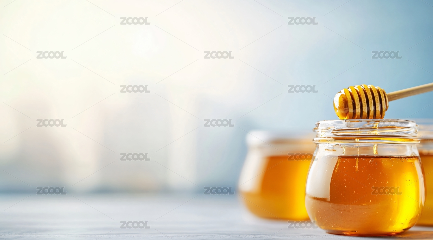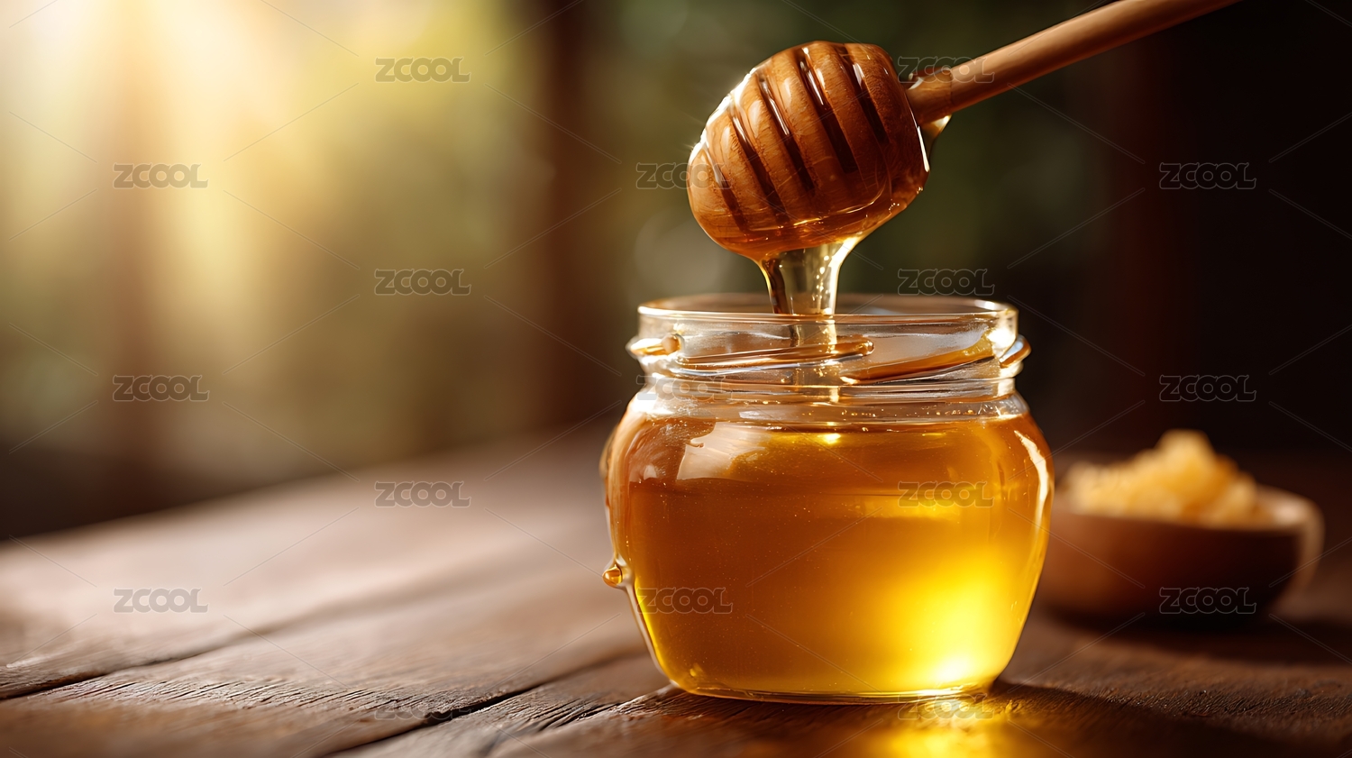 木桌蜂蜜罐与蜜勺的自然美食素材