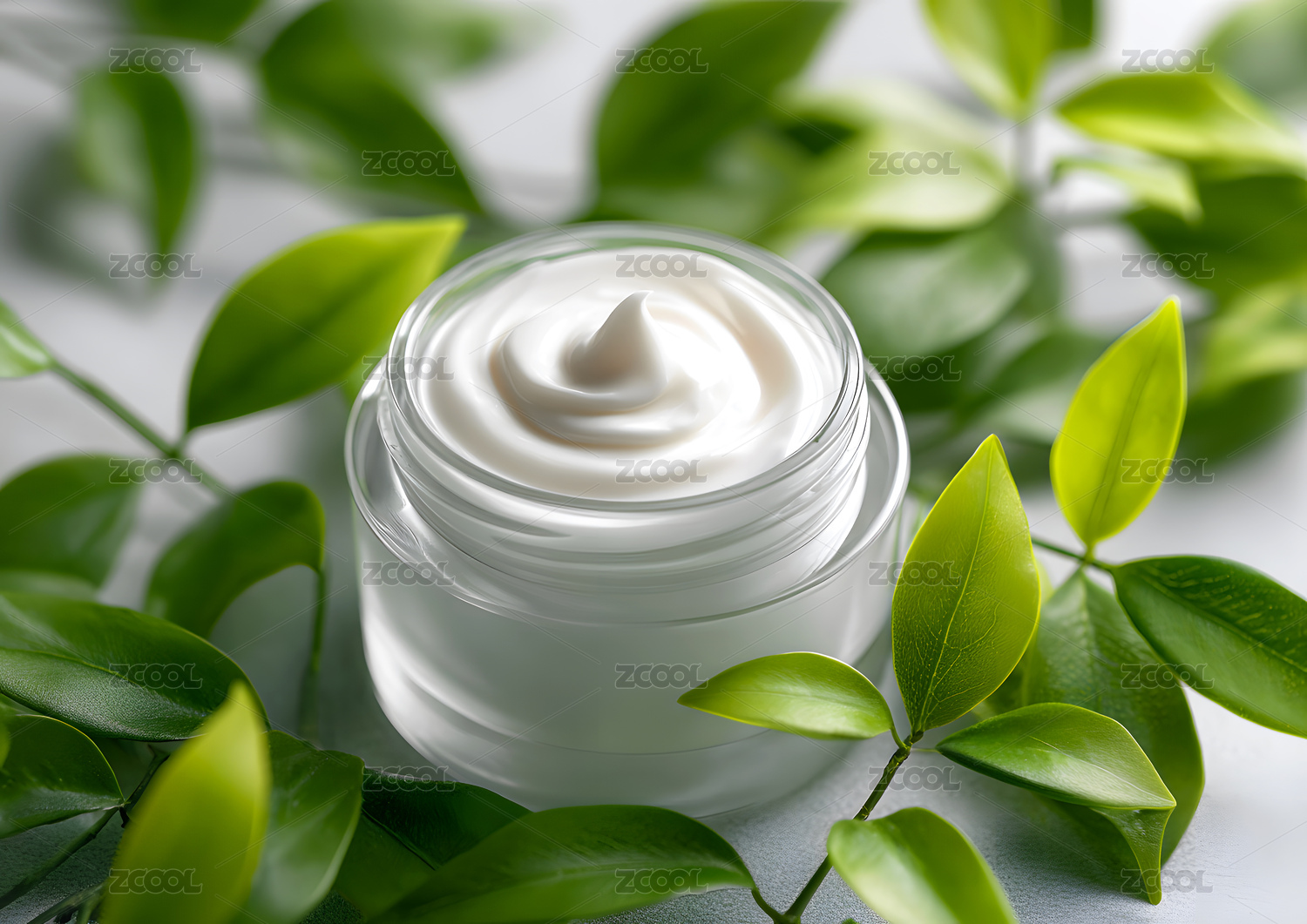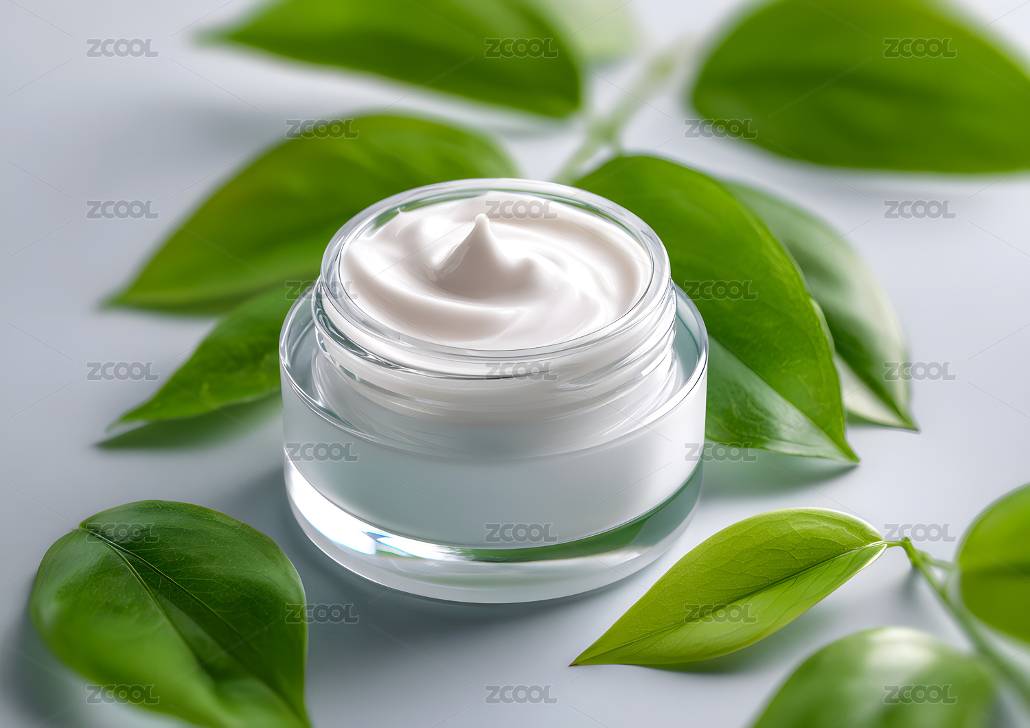 薄荷绿叶围绕的浅绿色面霜玻璃罐