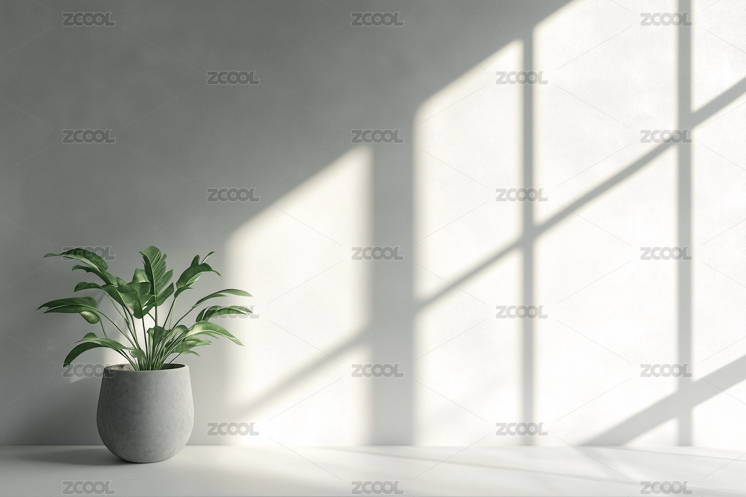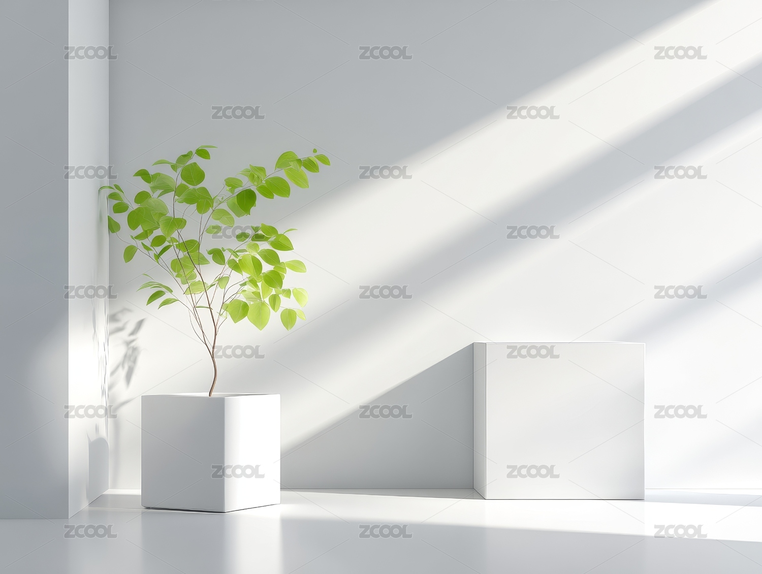 干净的室内白墙和绿植装饰简约空白渲染背景