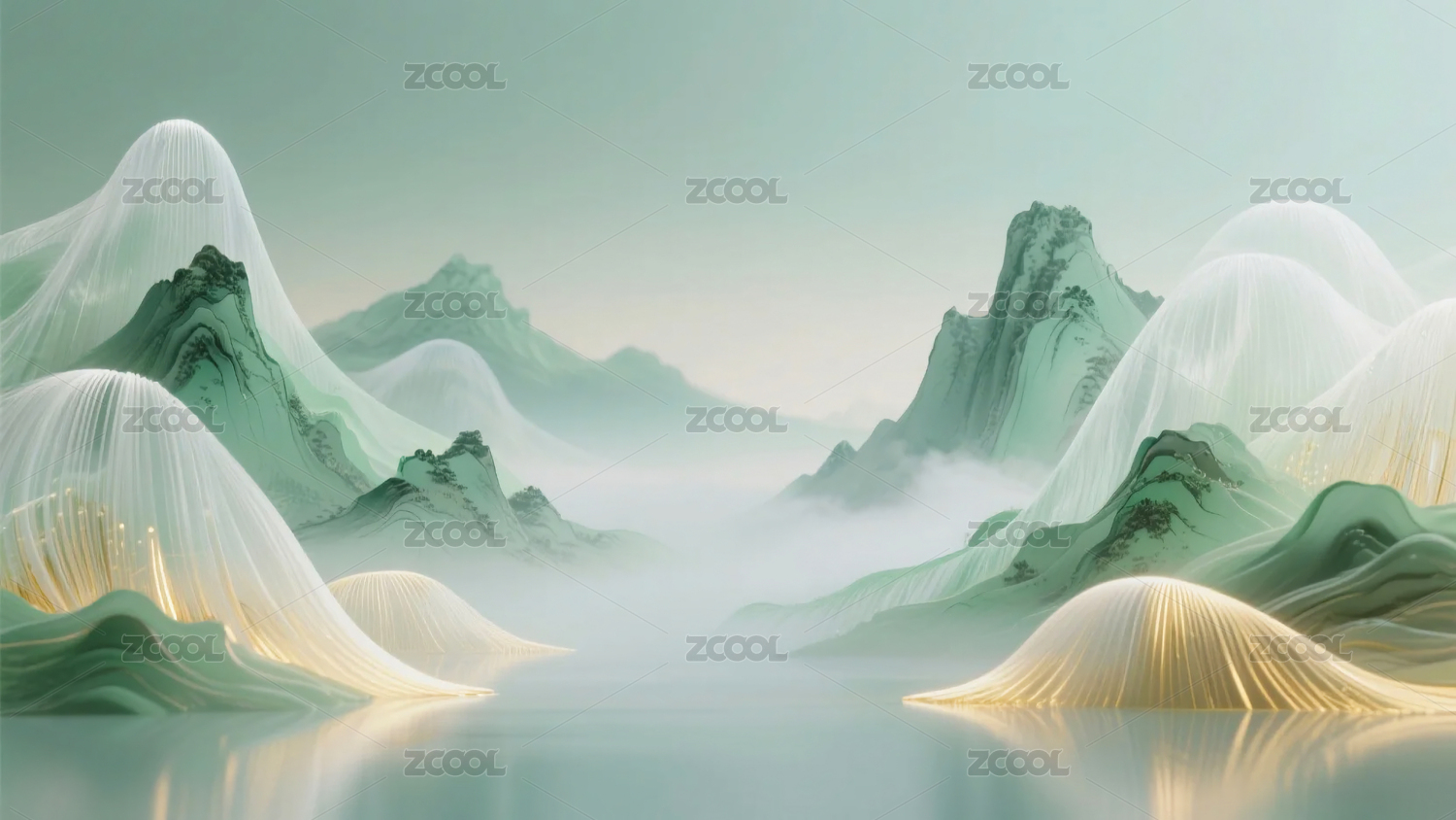 新中式梦幻绿白金色渐变山水画