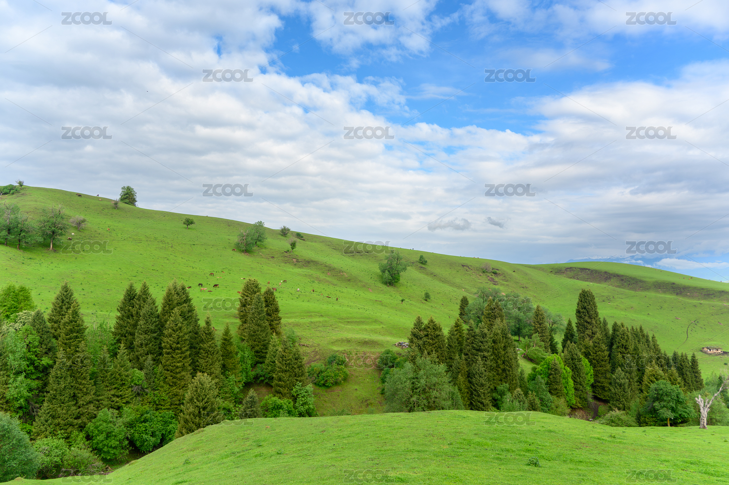 草原,草坪,牛羊,动物,马匹,植物,树,天空