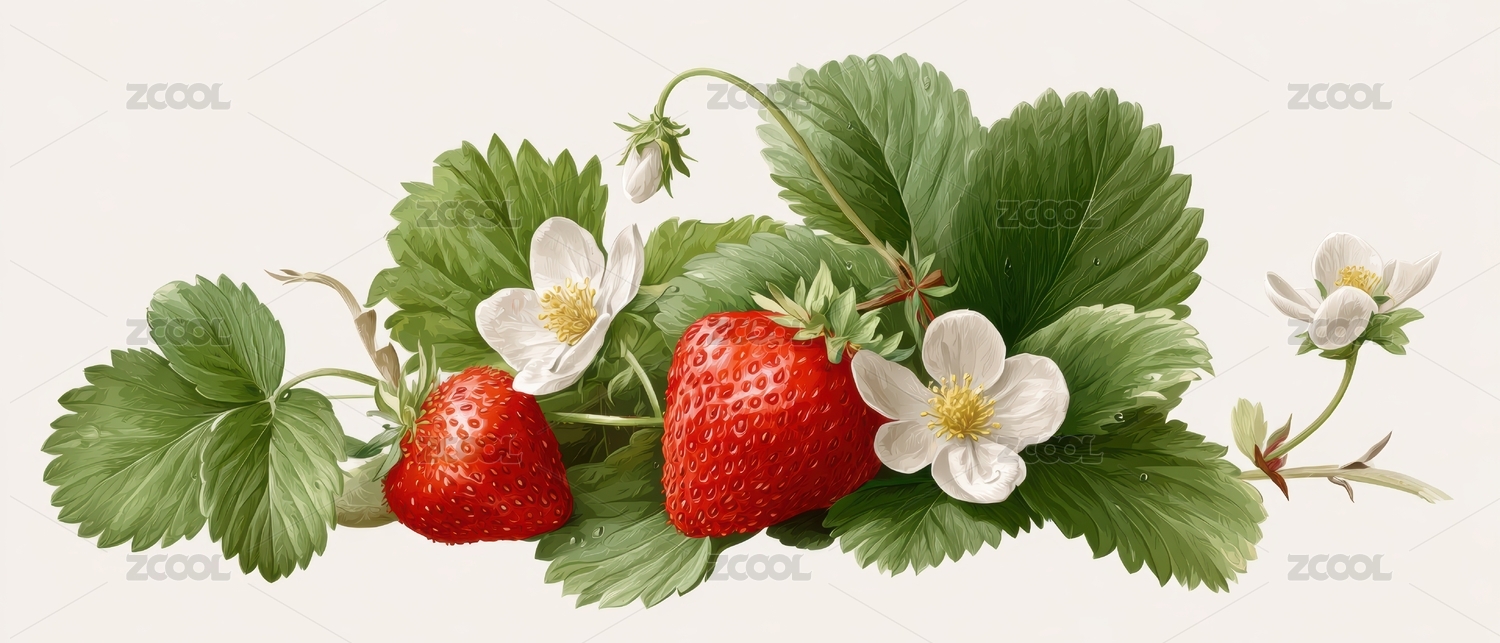 粉色与白色草莓花及绿叶的精美插画