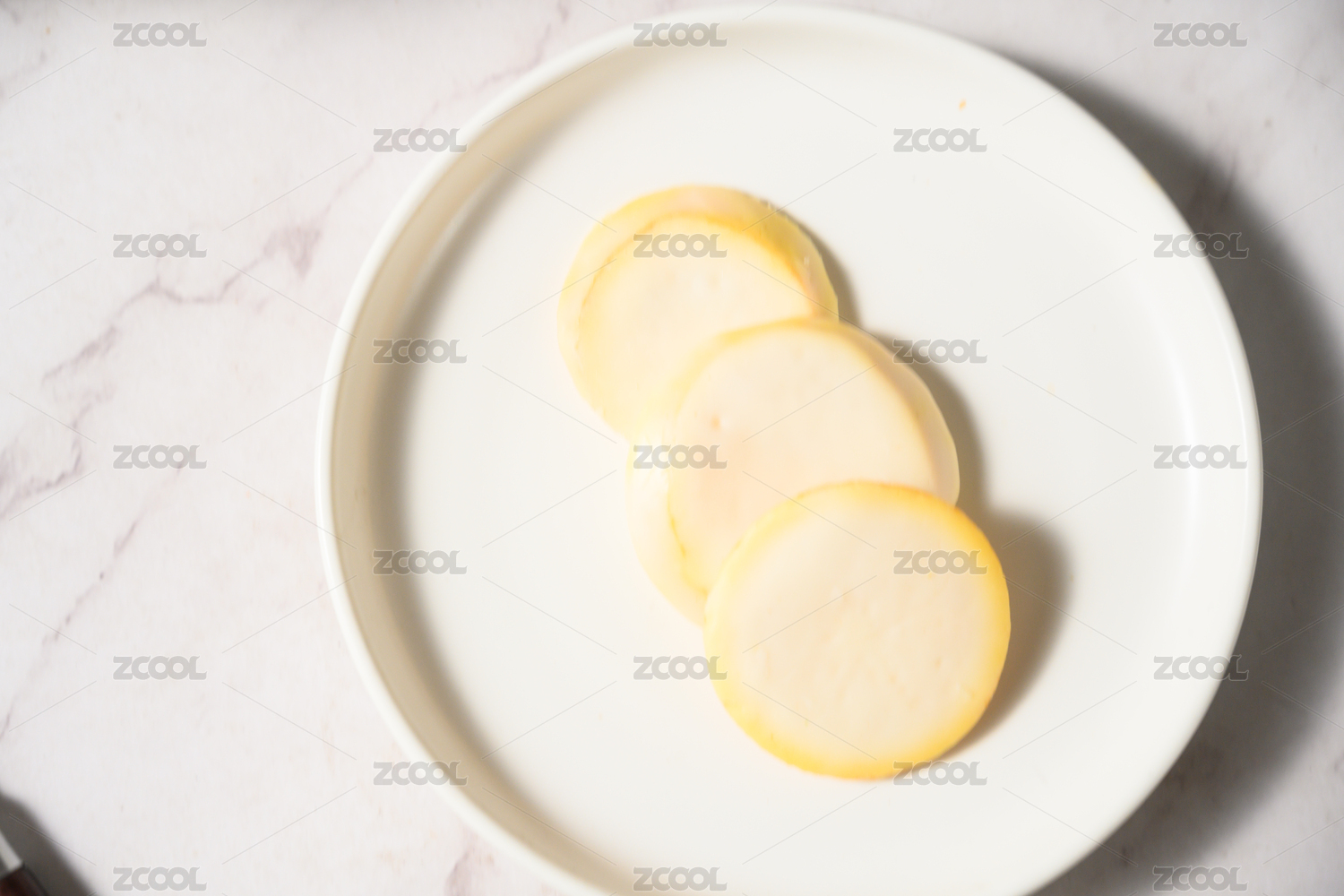 桌面上的盘子里的美味可口的白巧克力橙子片