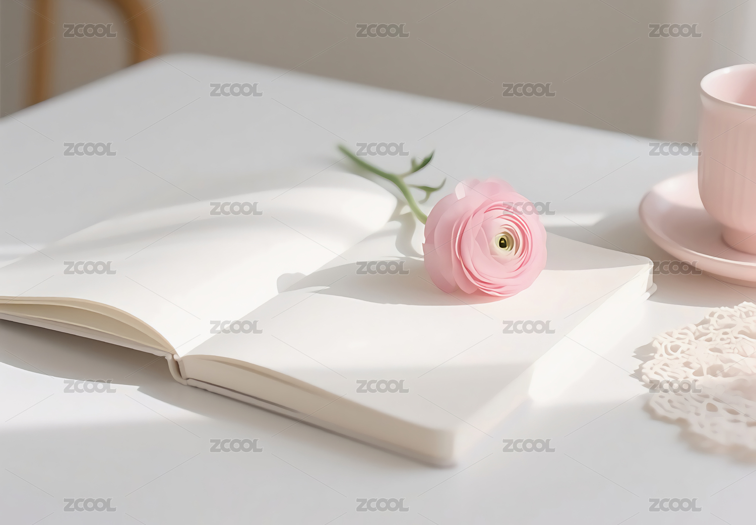 一本打开的书本上放着一朵粉红色的盛开的玫瑰花