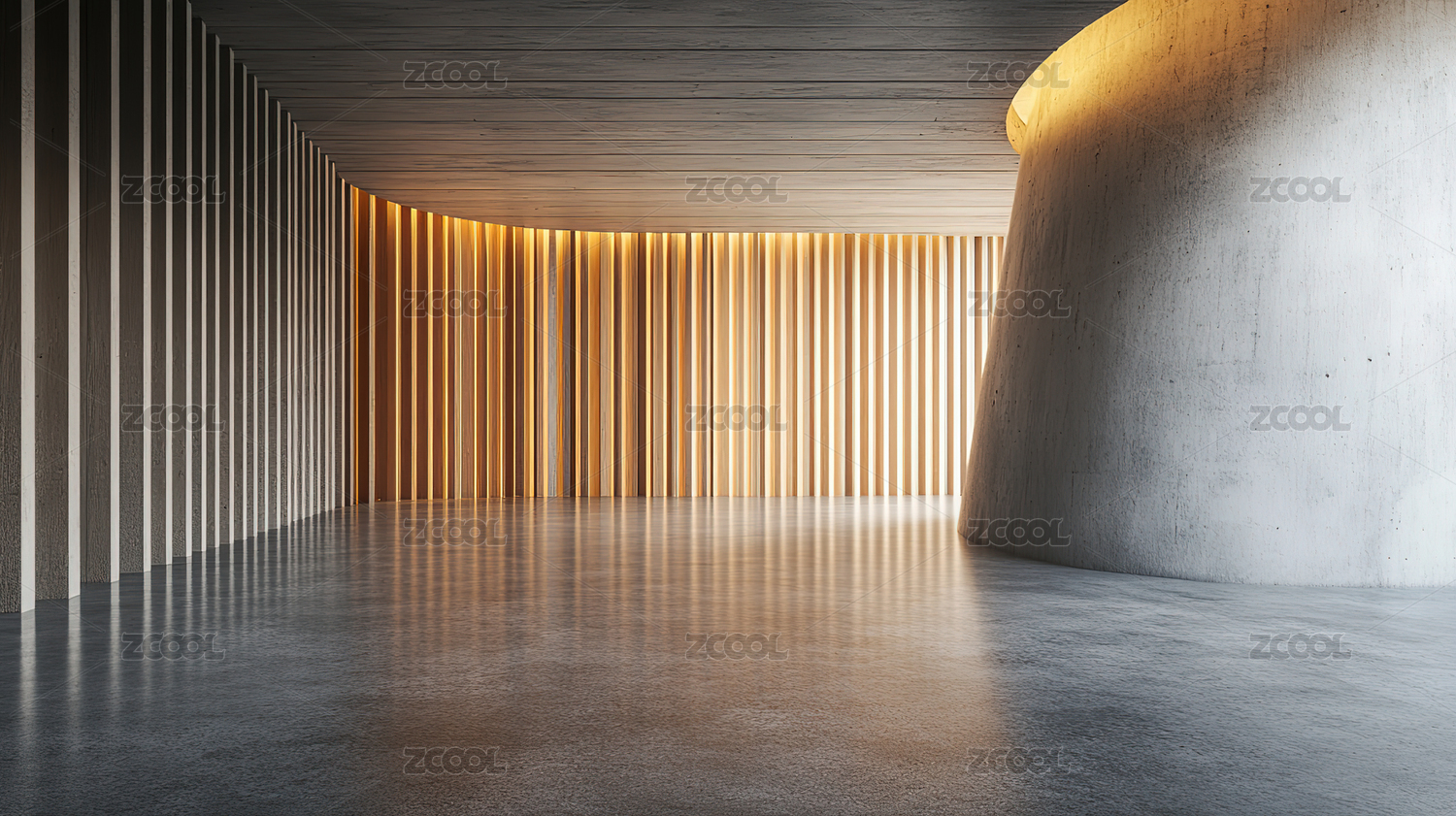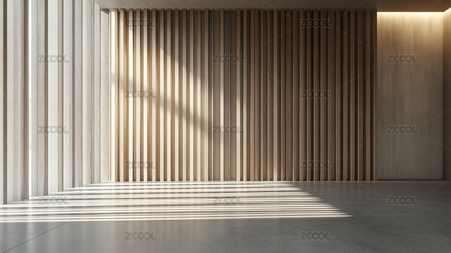 木质条纹墙面的混凝土空间