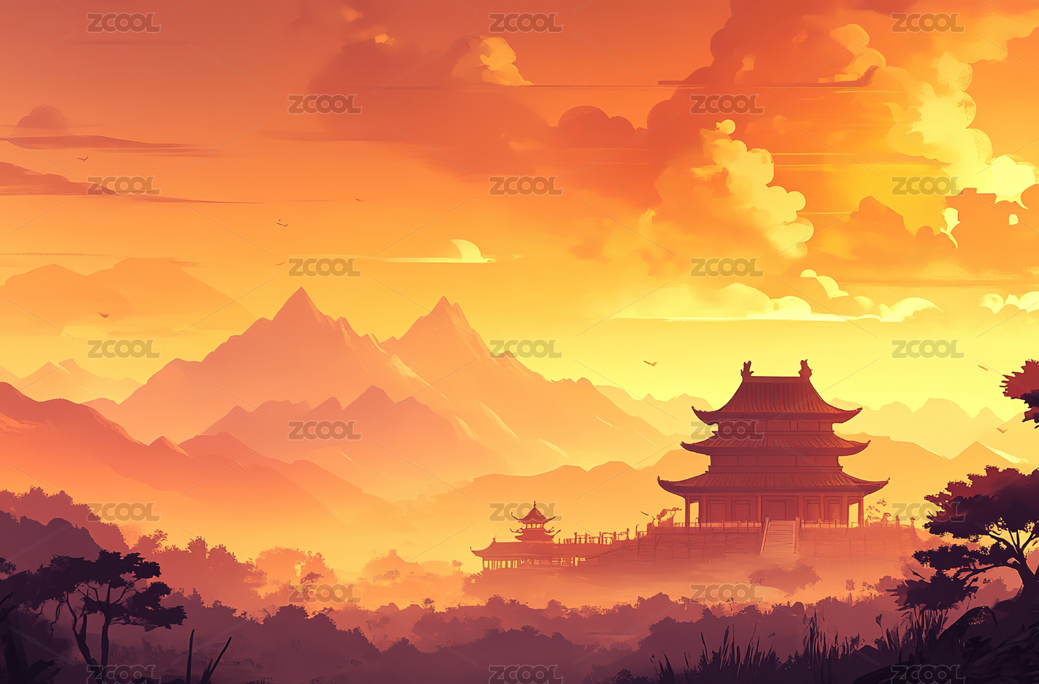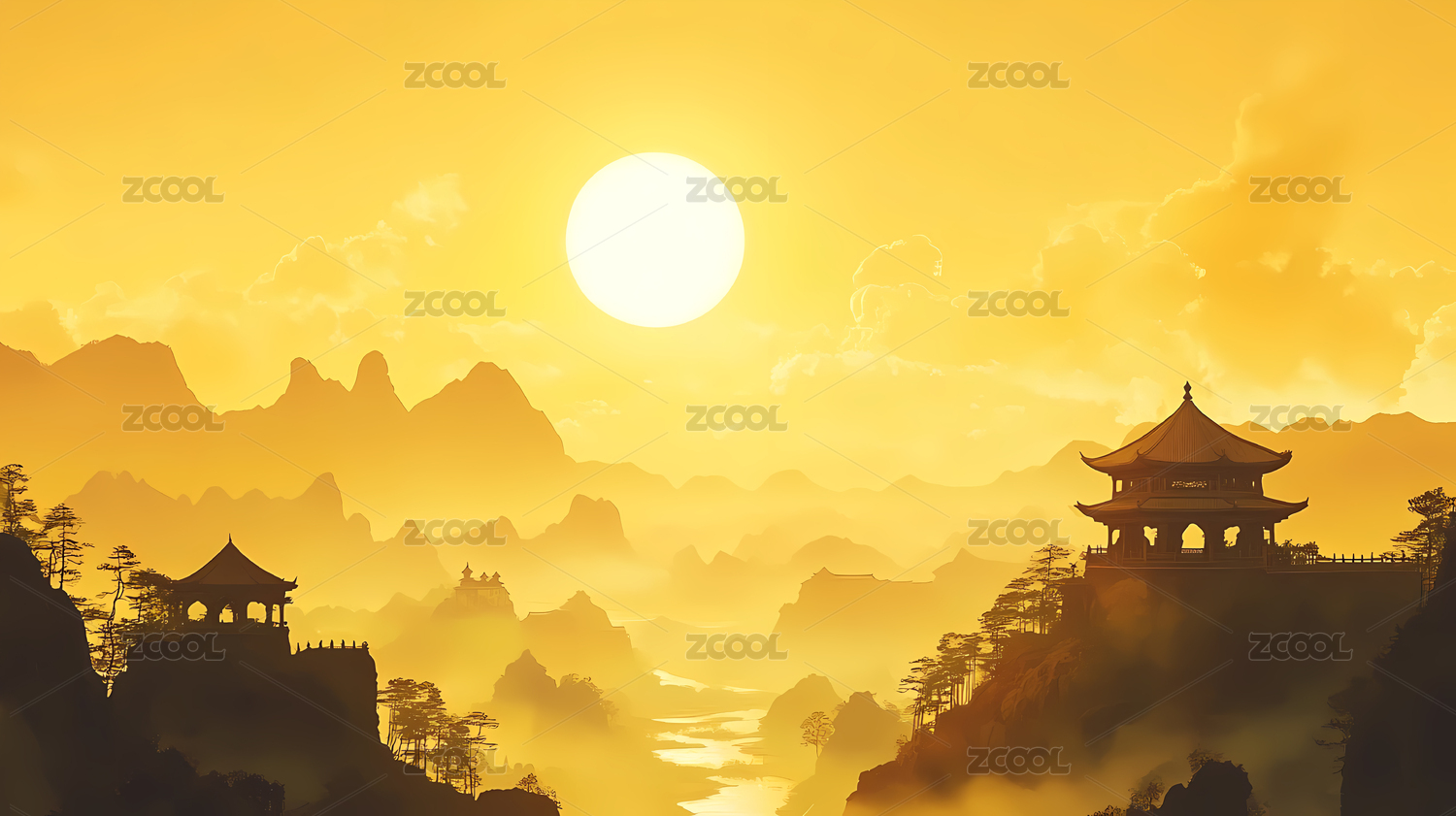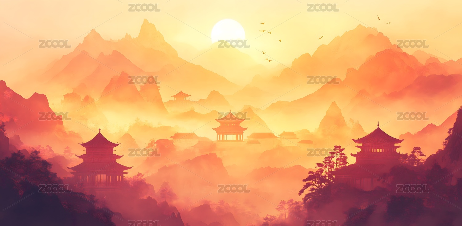 山峦日出下的中国古建筑