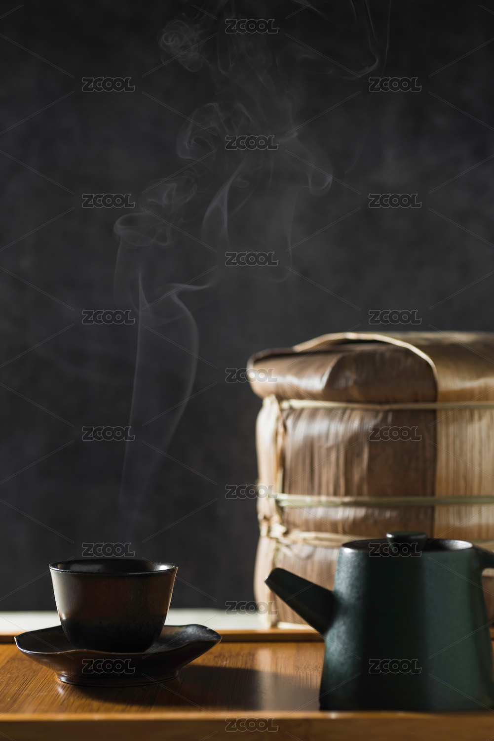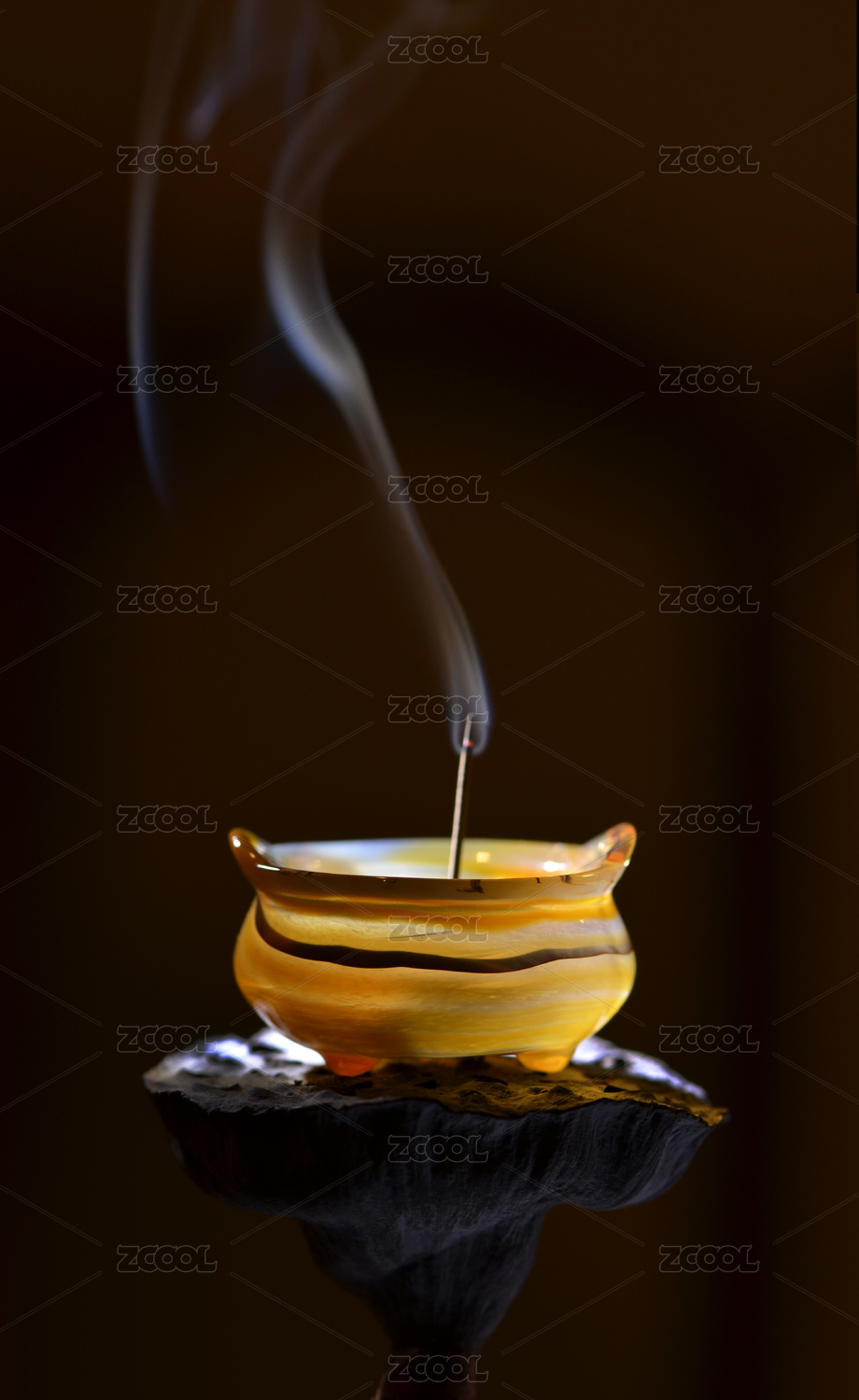 陶瓷茶具和袅袅飘散的沉香烟雾