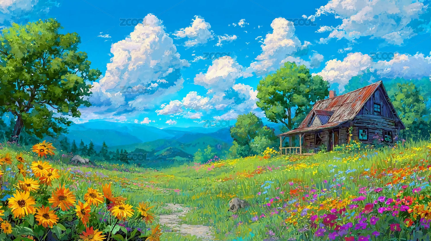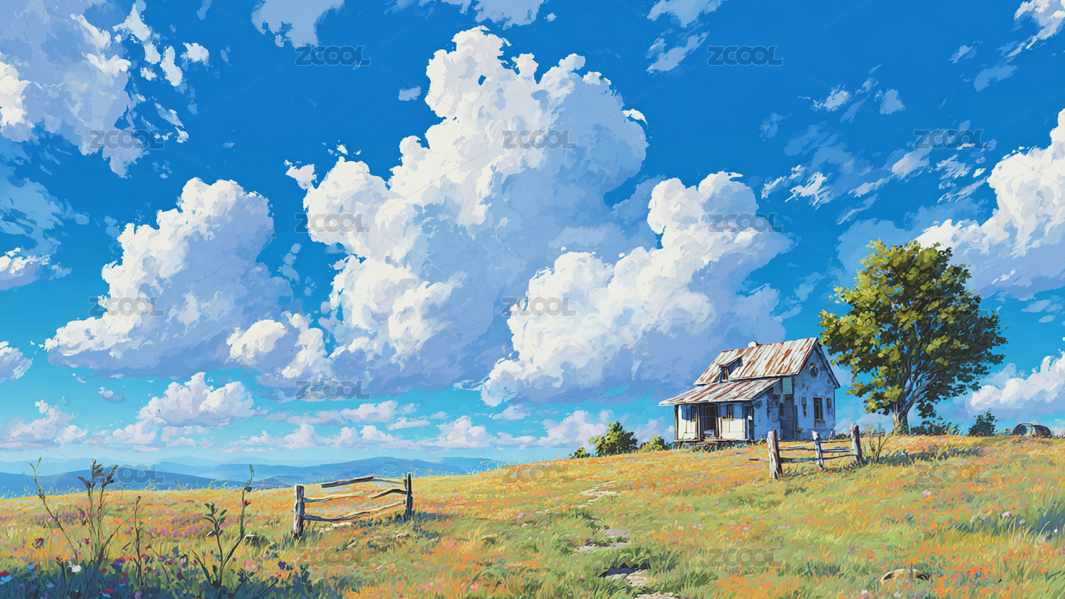 夏天户外旅行山峰房屋乡村风景蓝天白云插画