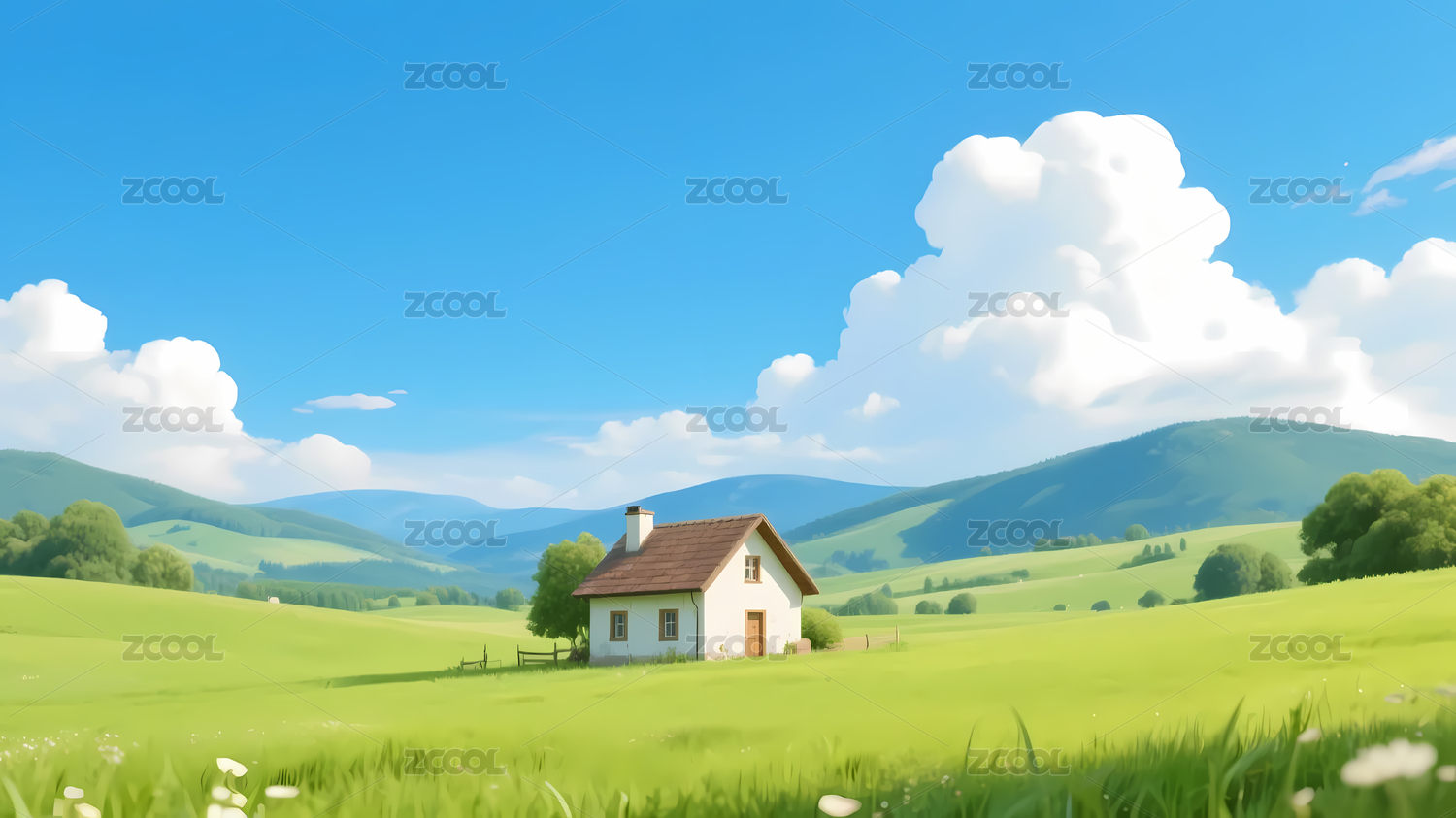 田园风光,红顶房屋,绿色草地,蓝天白云,树木,乡村景致,风景,美景,自然,屋