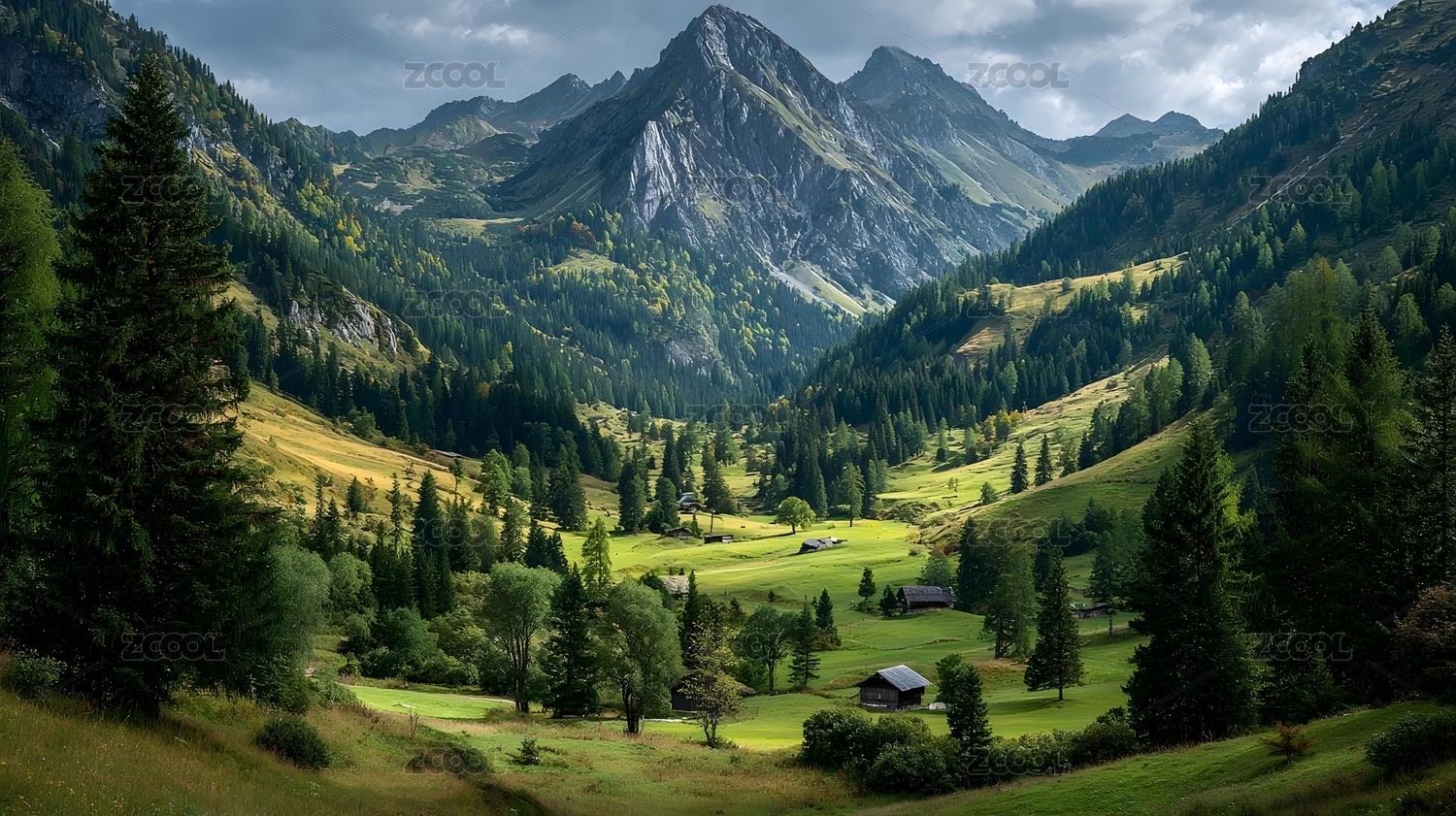 云朵,蓝天,山脉,绿色,森林,树木,自然,风景,阳光,山谷