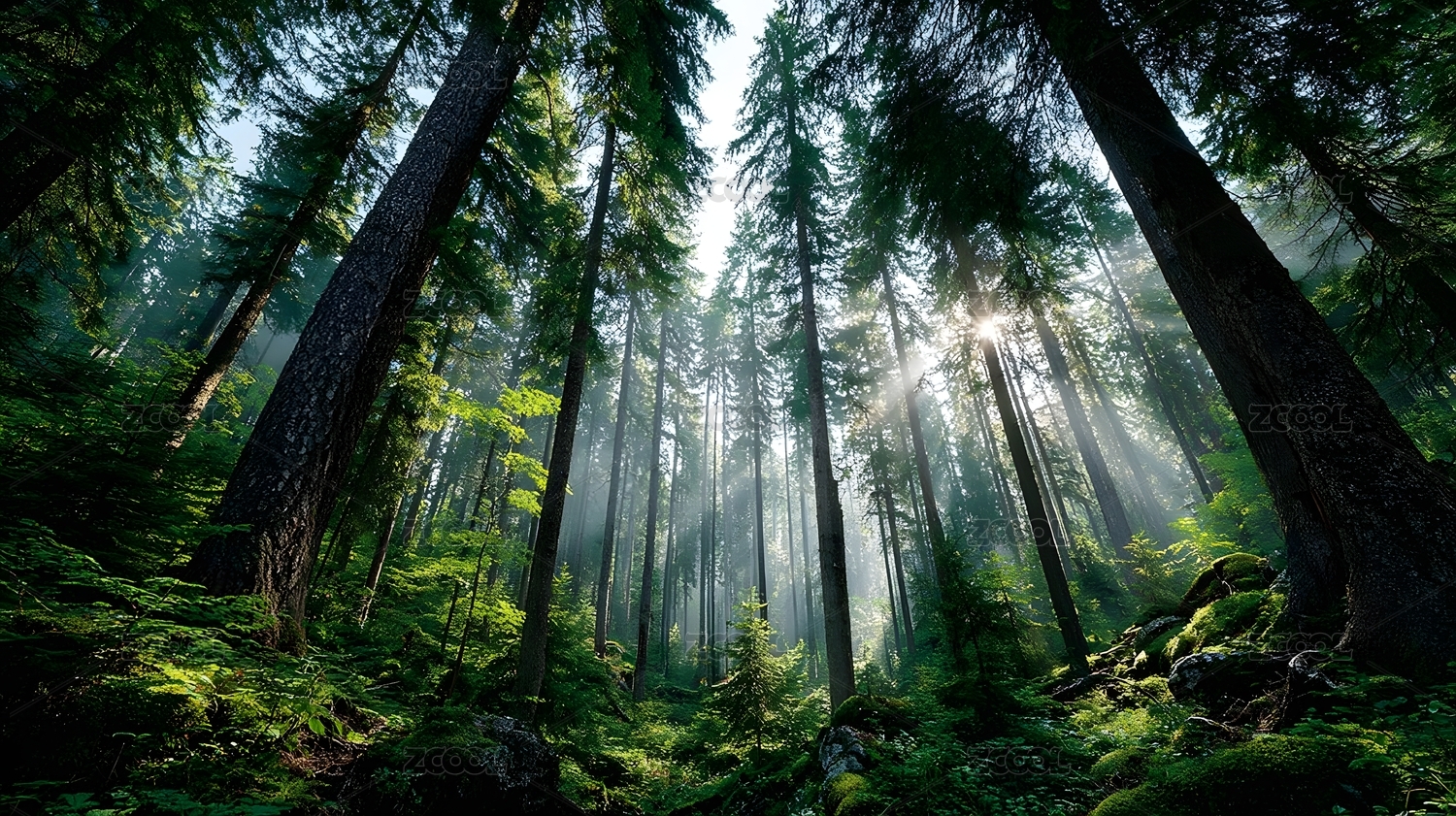 自然,树木,松树,阳光,树丛,林间,森林,晨光,绿色,静谧