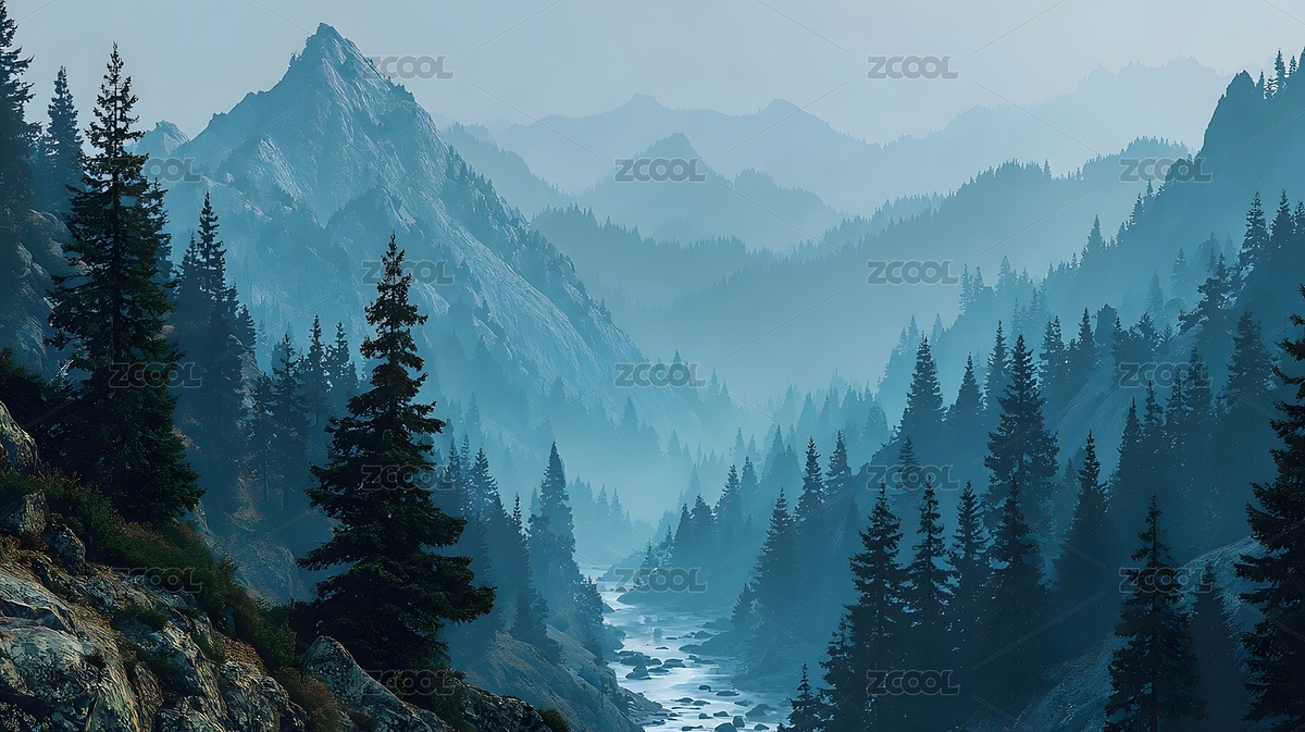山脉雾气森林