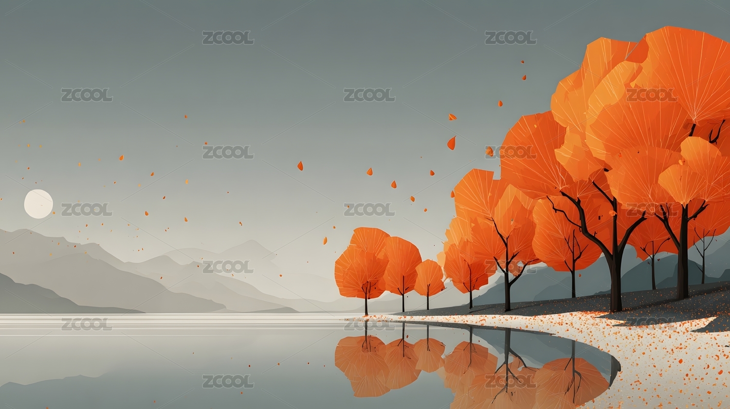 秋日湖畔橙红树影
