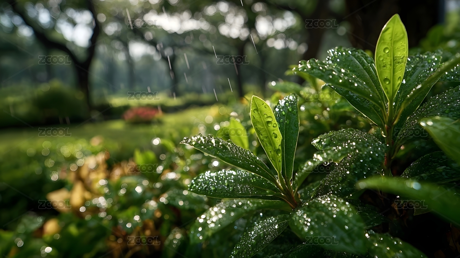 雨中绿植与阳光交织