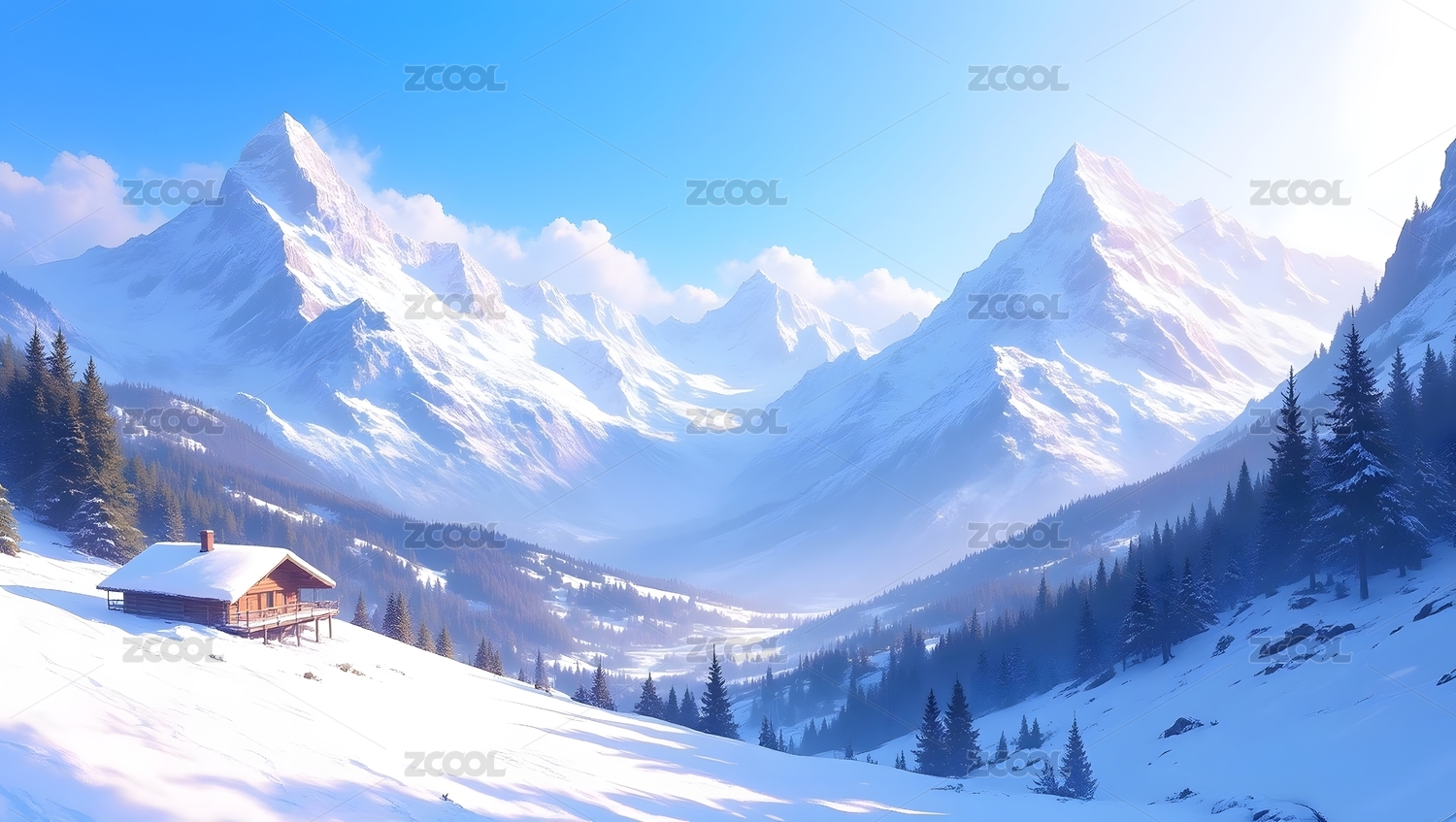 雪域小屋与雪山风光
