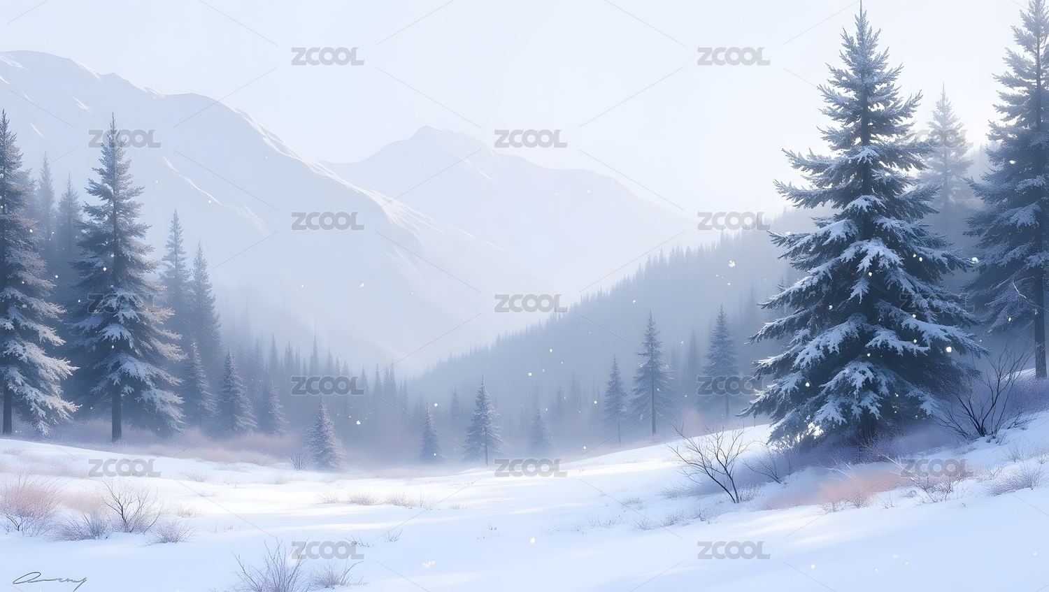 冬日雪松山谷