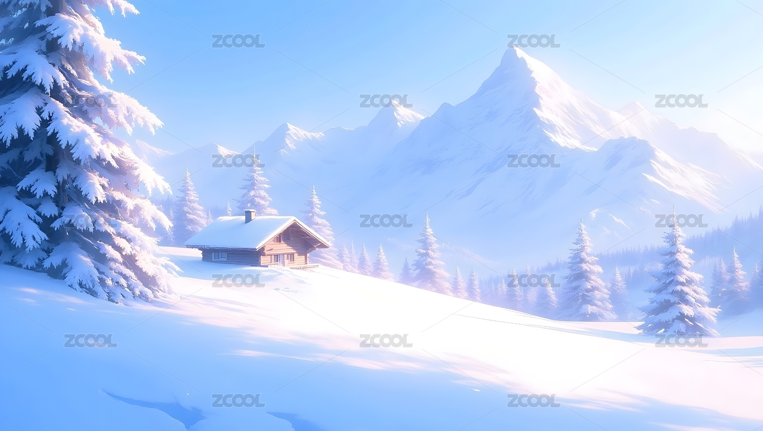 雪山木屋冬日风光