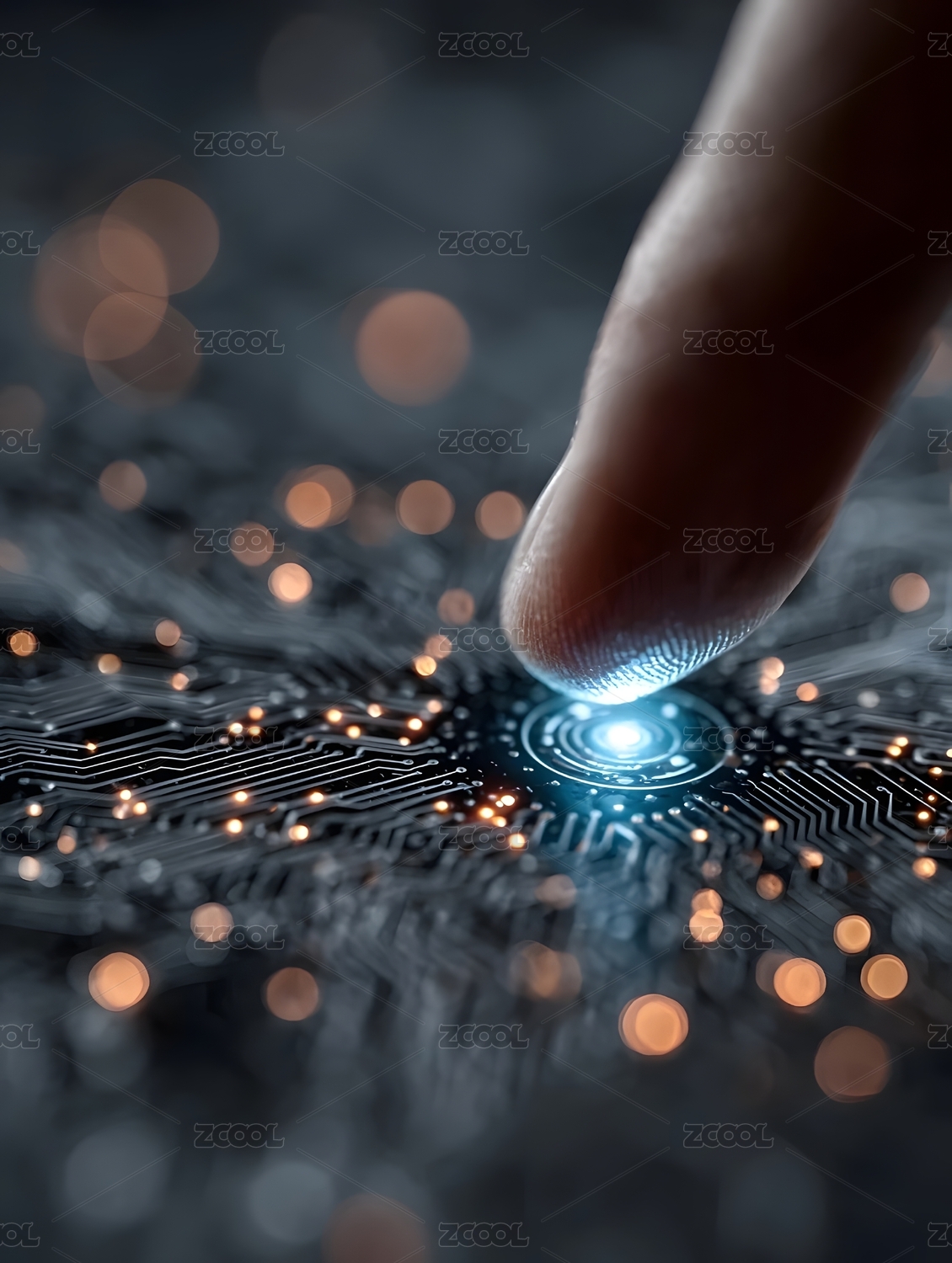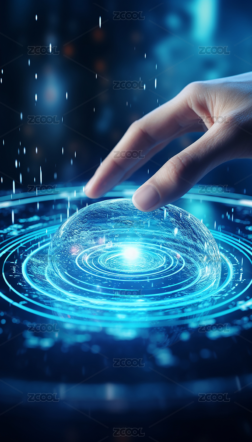 科技背景手指点击蓝色旋转圆圈光线轨迹3D