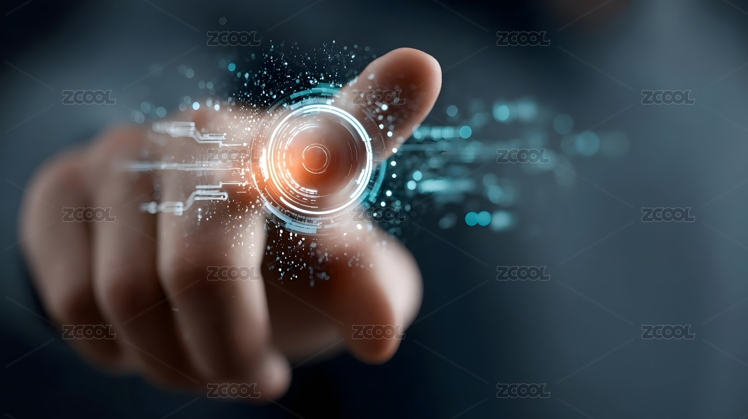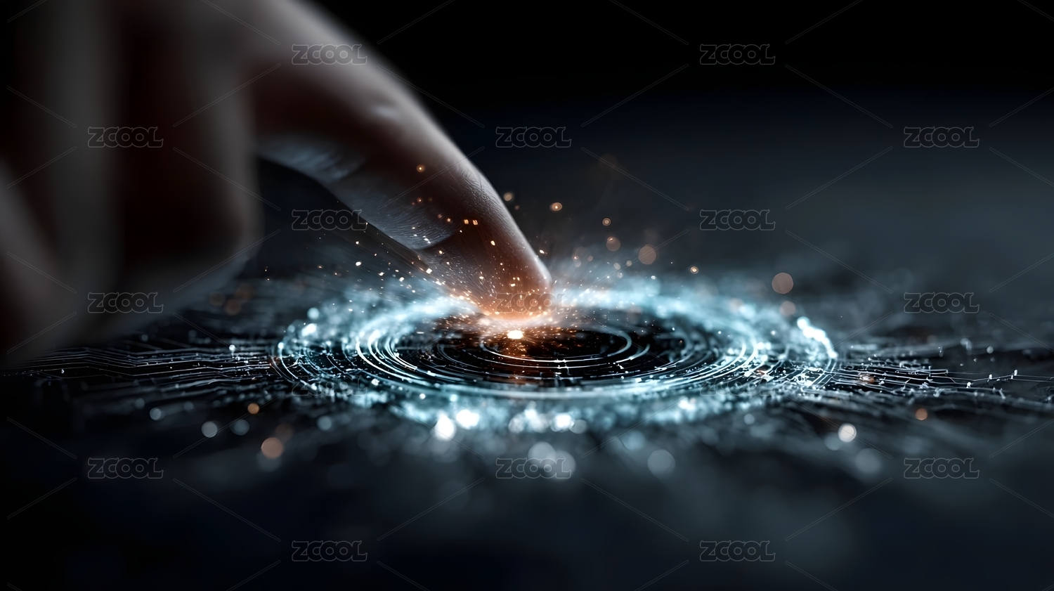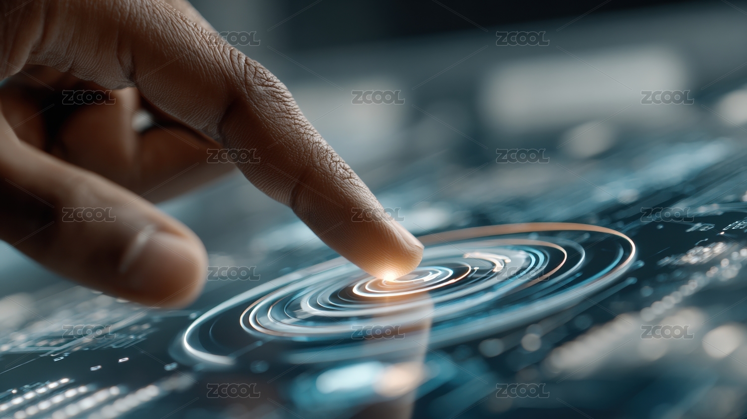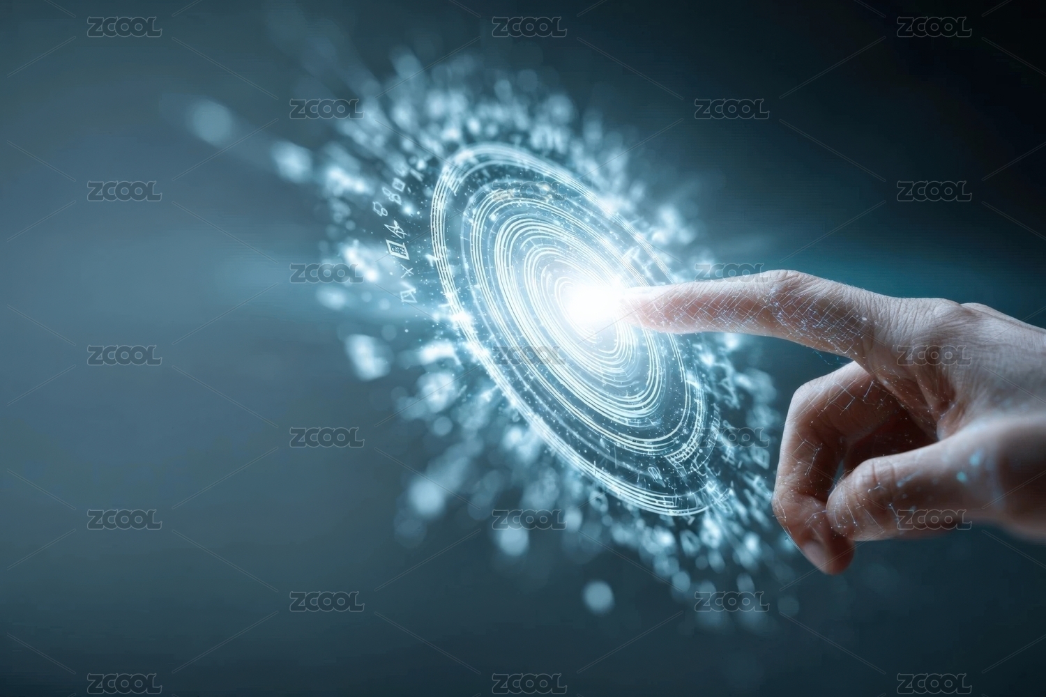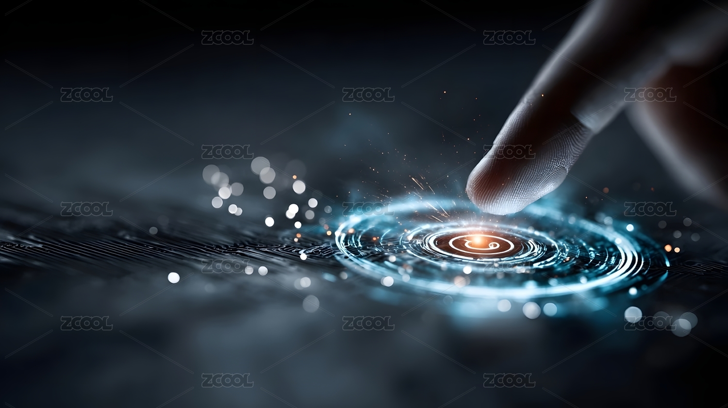 科技背景手指点击蓝色旋转圆圈光线轨迹3D