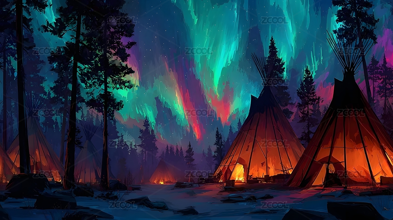 极光下的帐篷营地主题